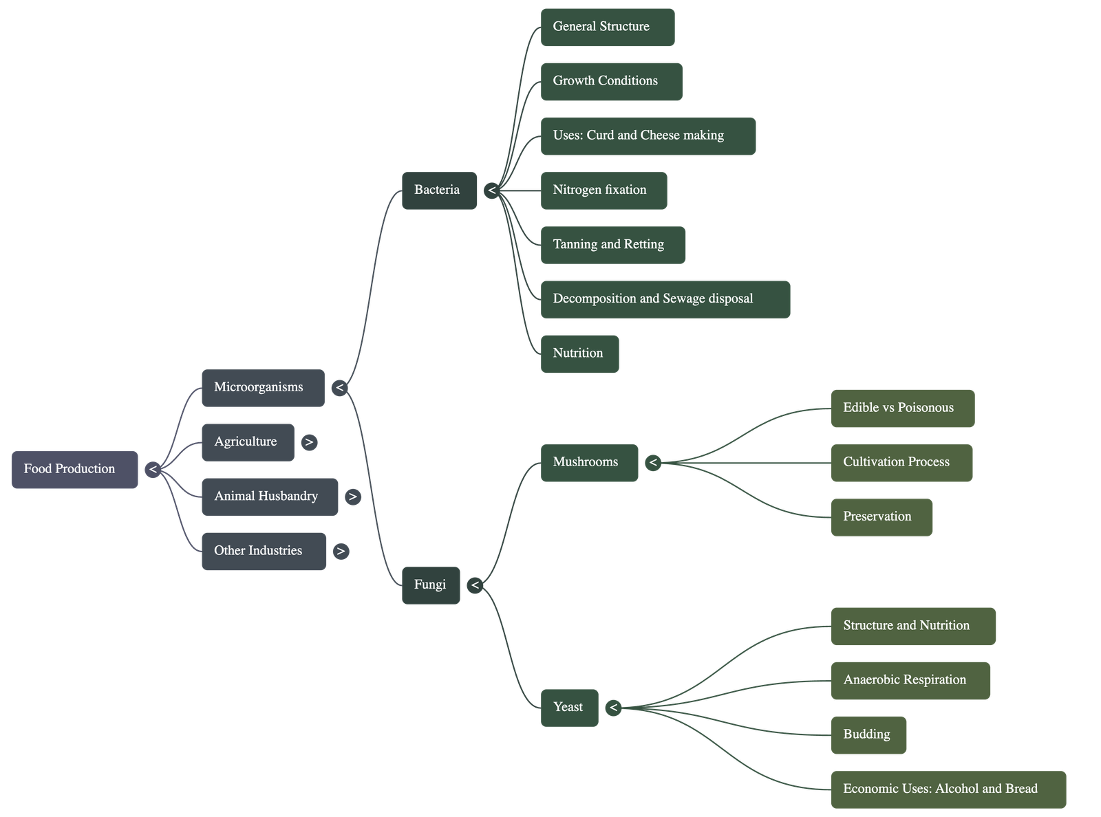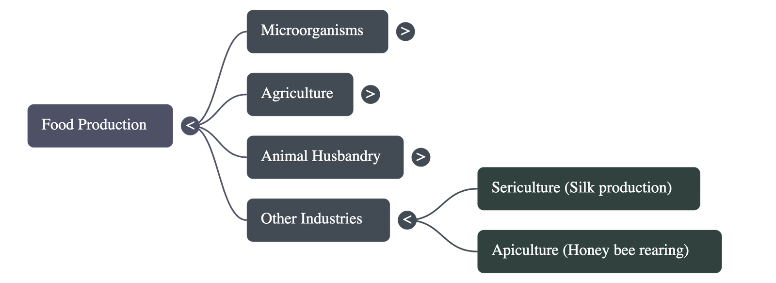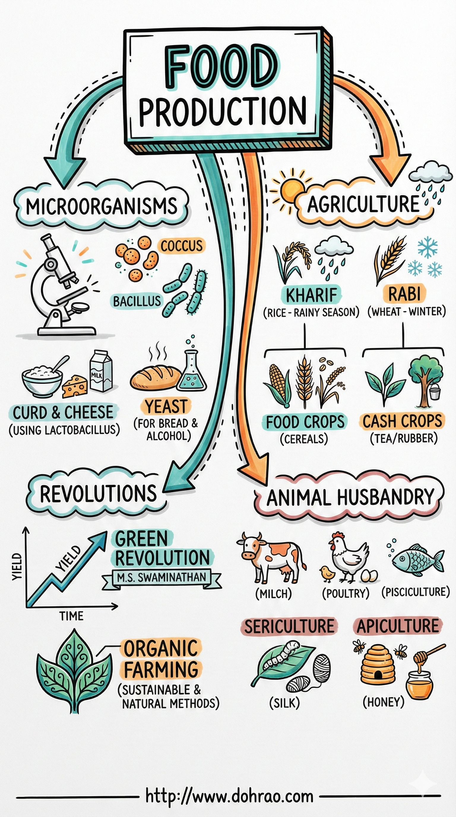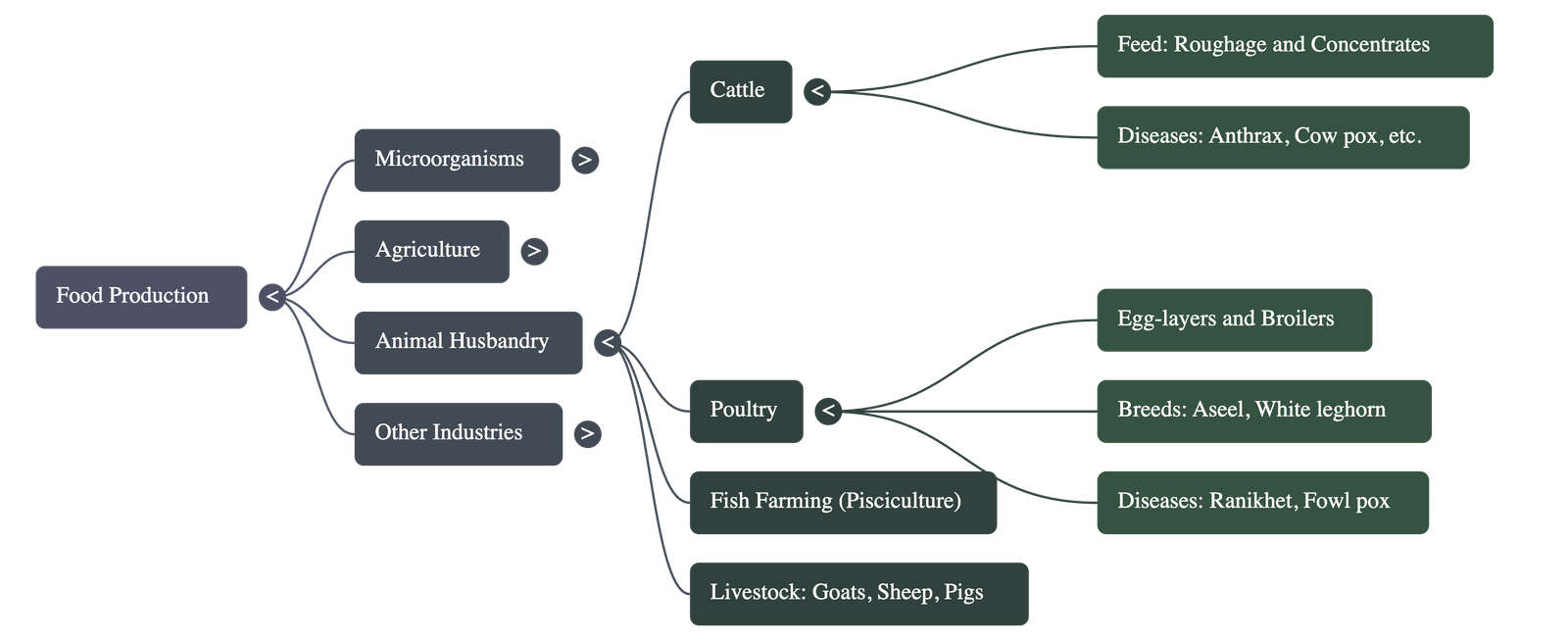 Analogy for Understanding: Think of Food Production as a vast industrial kitchen. The microbes (bacteria and yeast) are the specialized "mini-chefs" that handle fermentation and chemical changes; Agriculture is the "pantry" providing raw ingredients like grains and vegetables; and Animal Husbandry is the "dairy and meat station" that manages livestock to ensure a steady supply of protein and milk.