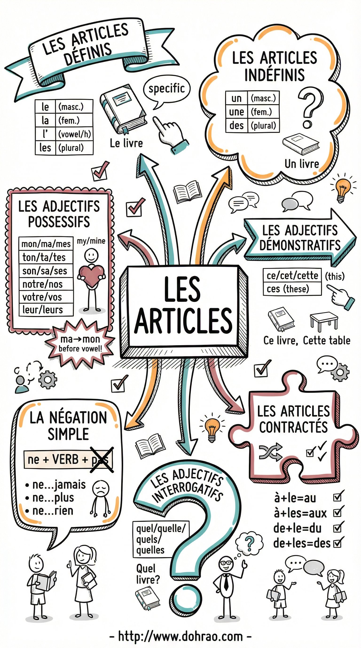 Enfin, le chapitre révise les bases grammaticales telles que les articles, les adjectifs possessifs et les verbes au présent.