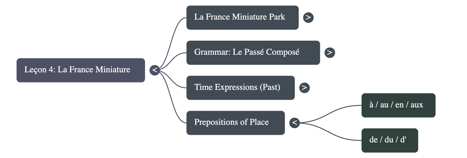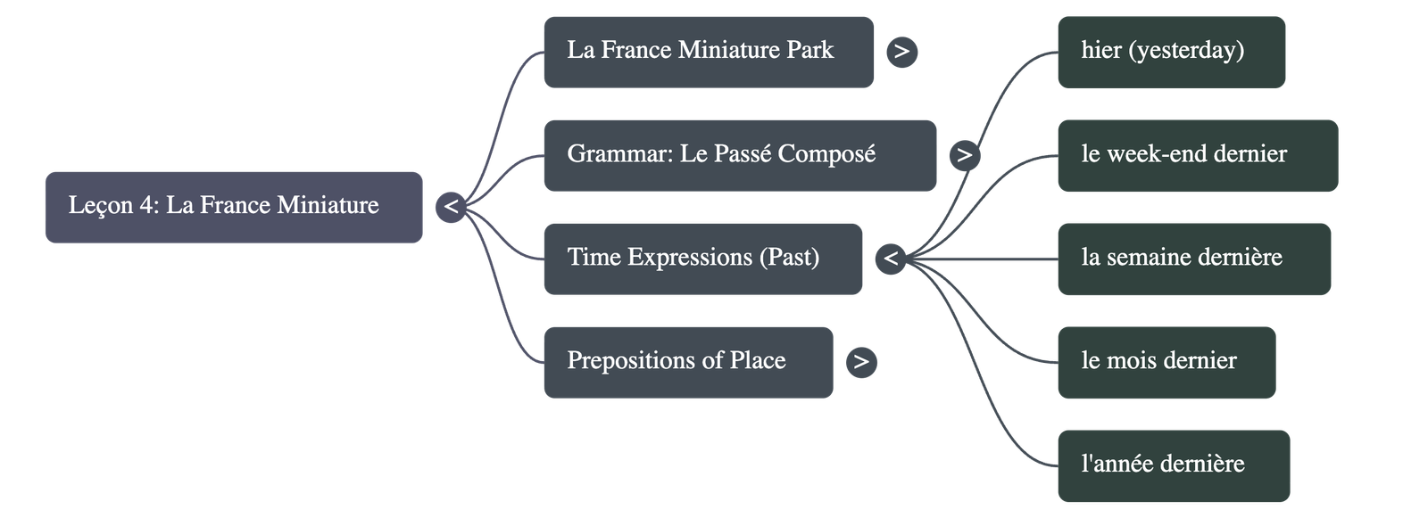 Students learn to use time expressions such as "yesterday," "last week," and "last month." - Le cours traite également des prépositions de lieu nécessaires pour parler des villes et des pays.