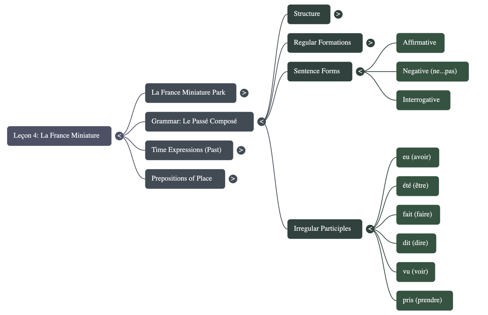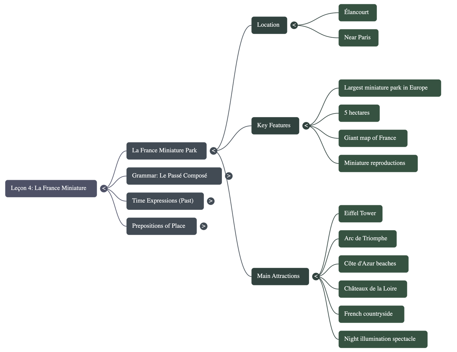 In the evening, the miniature monuments are illuminated with a thousand lights during a magical night show. - La leçon explique la formation du passé composé, utilisé pour exprimer une action terminée dans le passé.