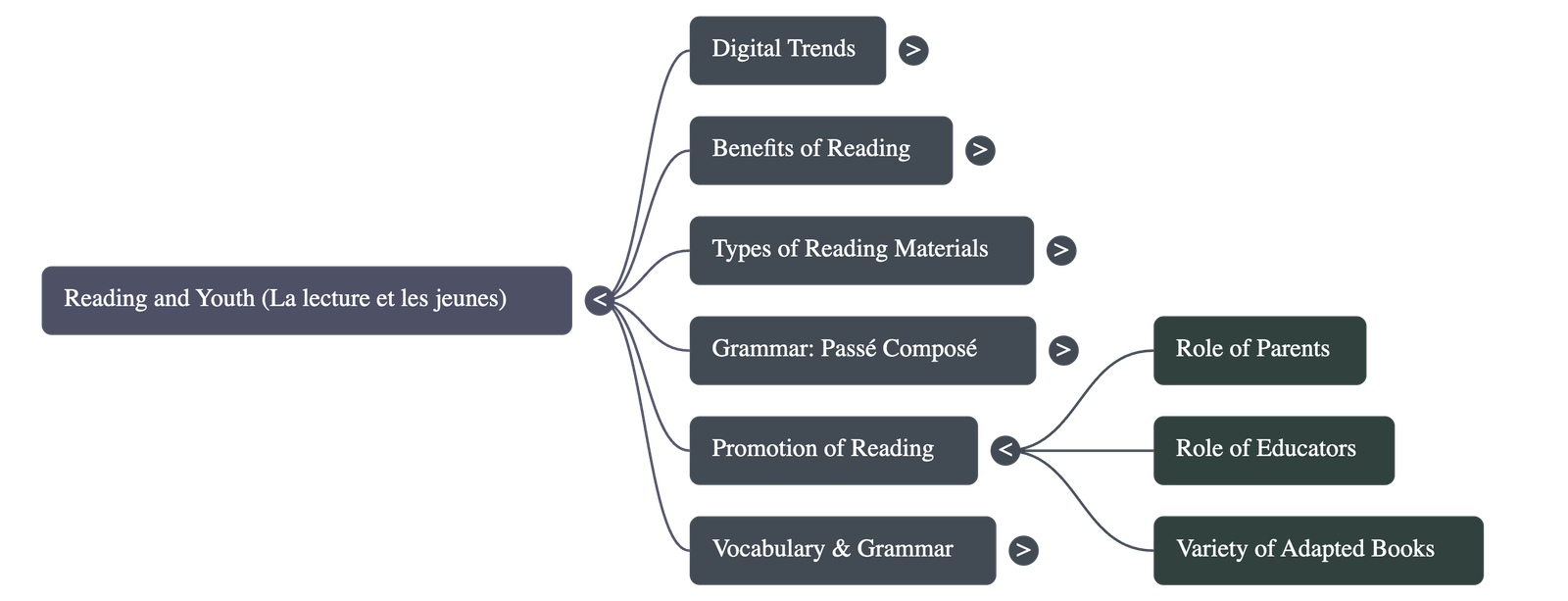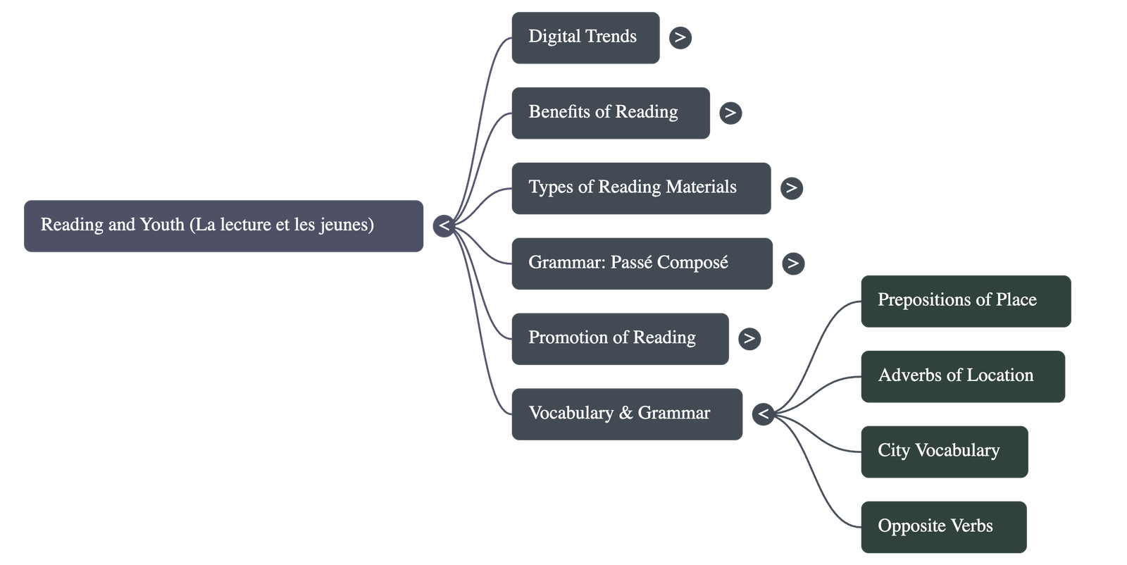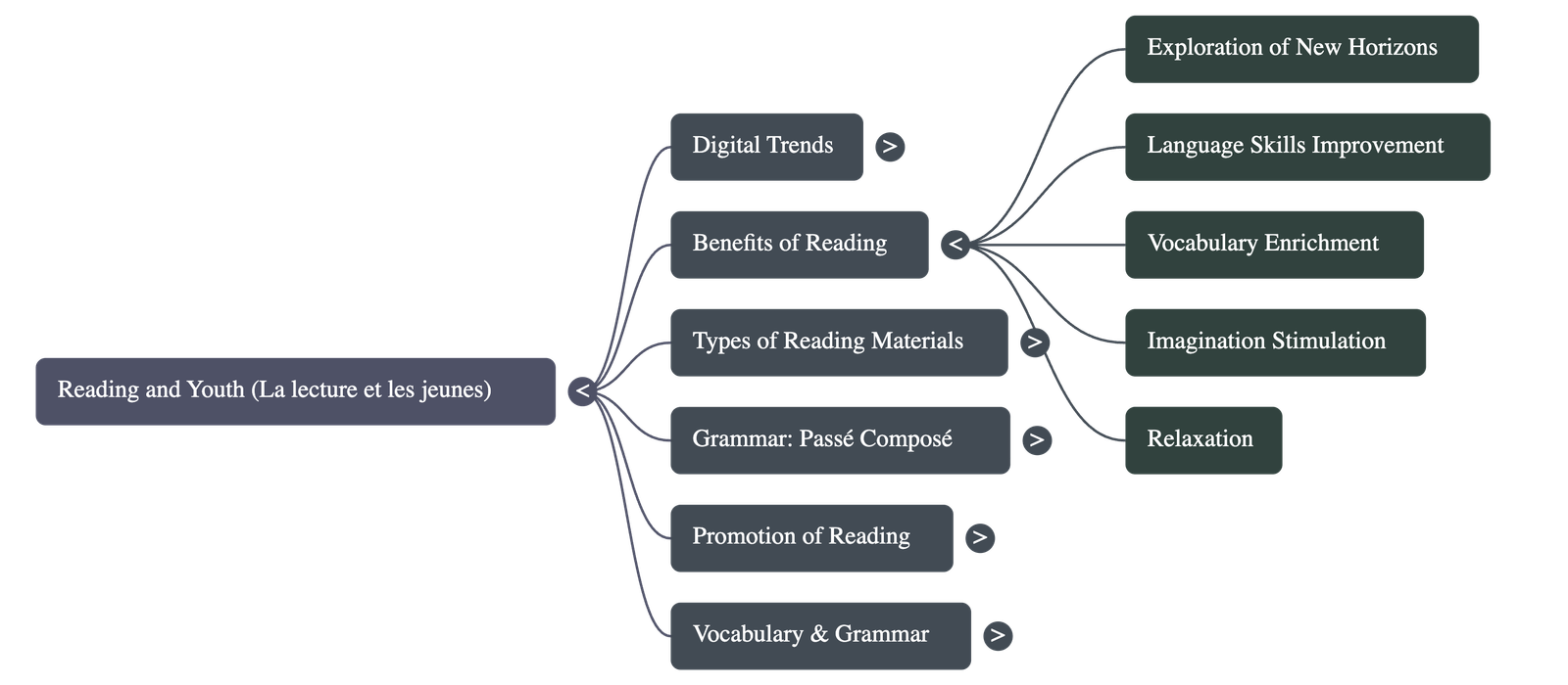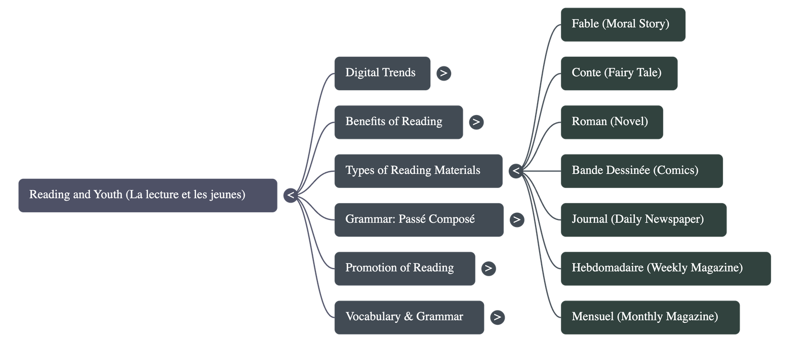Young readers can enrich their vocabulary, improve their written expression, and stimulate their imagination thanks to books. - Le chapitre définit différents genres littéraires comme la fable, le conte, le roman et la bande dessinée.