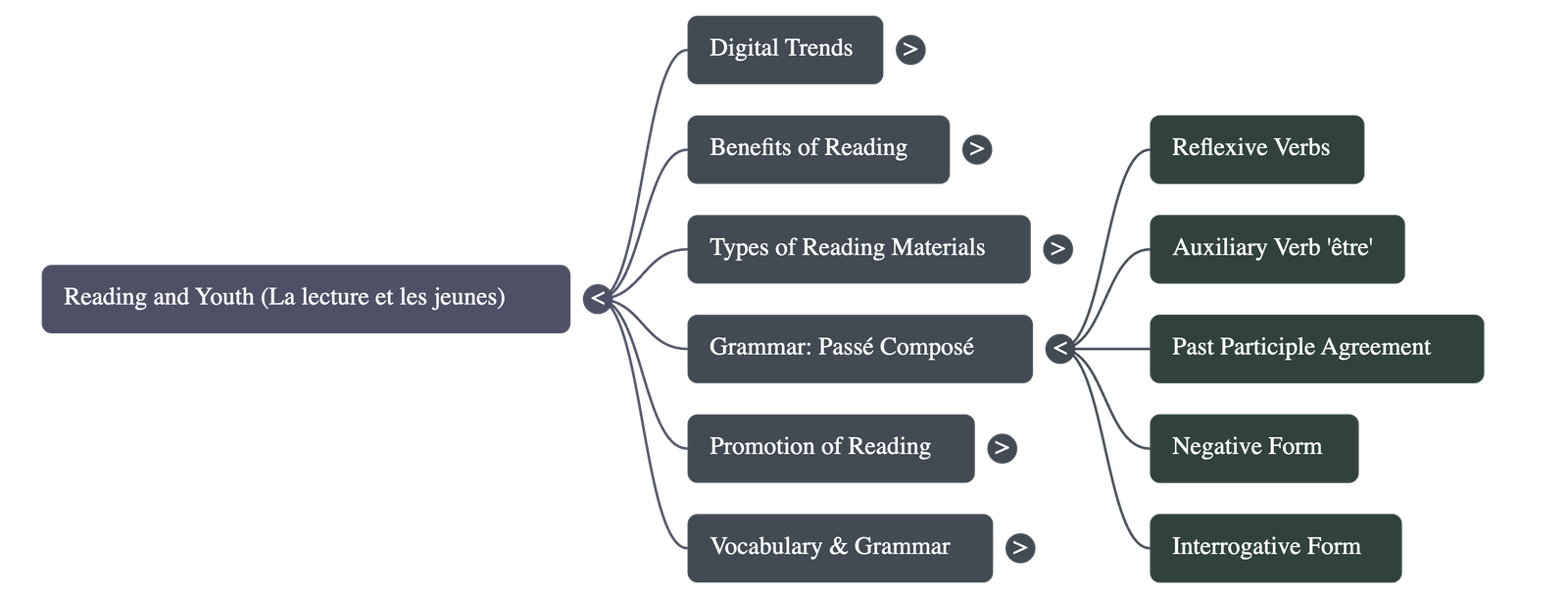These verbs are always conjugated with the auxiliary "être," and the past participle generally agrees with the subject. - Le vocabulaire de la ville est abordé, incluant des lieux comme la bibliothèque, le marché, la poste et la librairie.