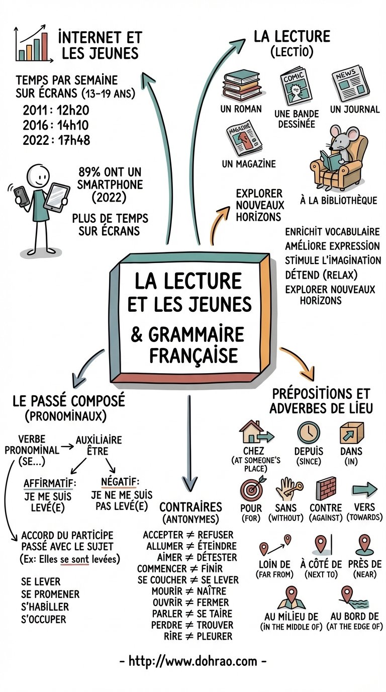 Statistics show that young people aged thirteen to nineteen spend more and more time on screens and the internet each week. - La lecture offre de nombreux avantages comme l'exploration de nouveaux horizons et l'accès à des univers inconnus.