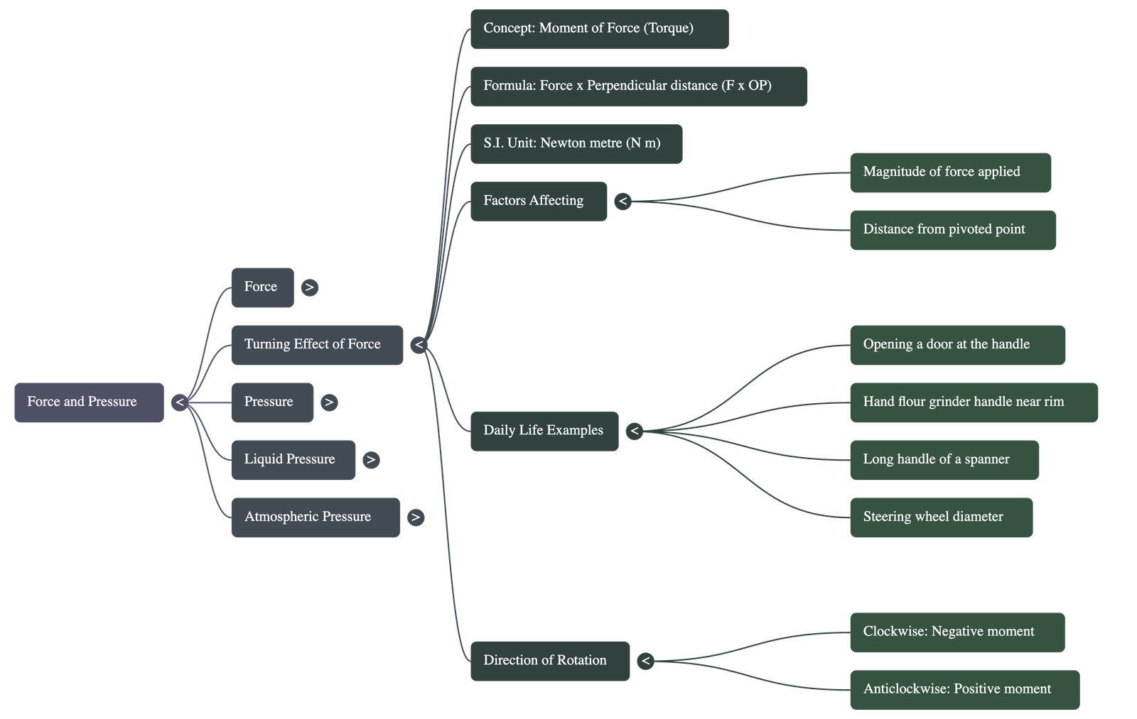 - Moment of Force (Torque): This is the measure of the turning effect and is calculated as the product of the magnitude of the force and the perpendicular distance of the force from the pivoted point.