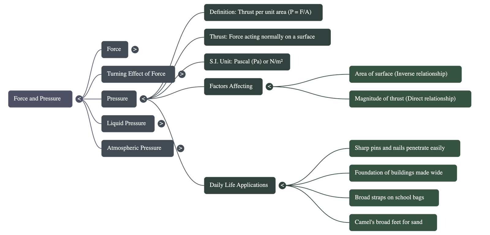 - Relationship with Area: For a constant thrust, pressure is inversely proportional to the area. This explains why sharp needles (small area) penetrate easily and why foundations of buildings are made wide (large area) to reduce pressure.