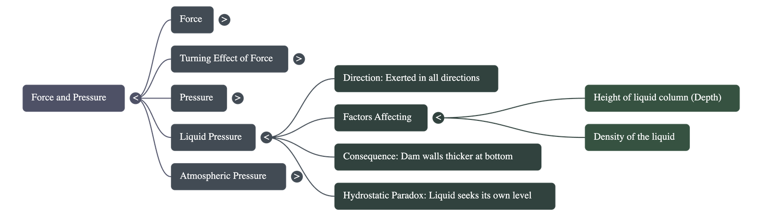 - Pascal's Law: The sources state that the pressure exerted by a liquid at a specific depth is the same in all directions.