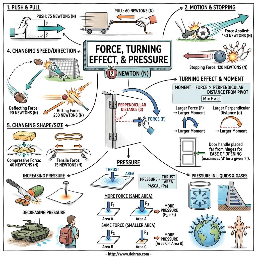 - Turning Effect: When a force is applied to a body pivoted at a point, it causes the body to rotate about that point (the axis of rotation).