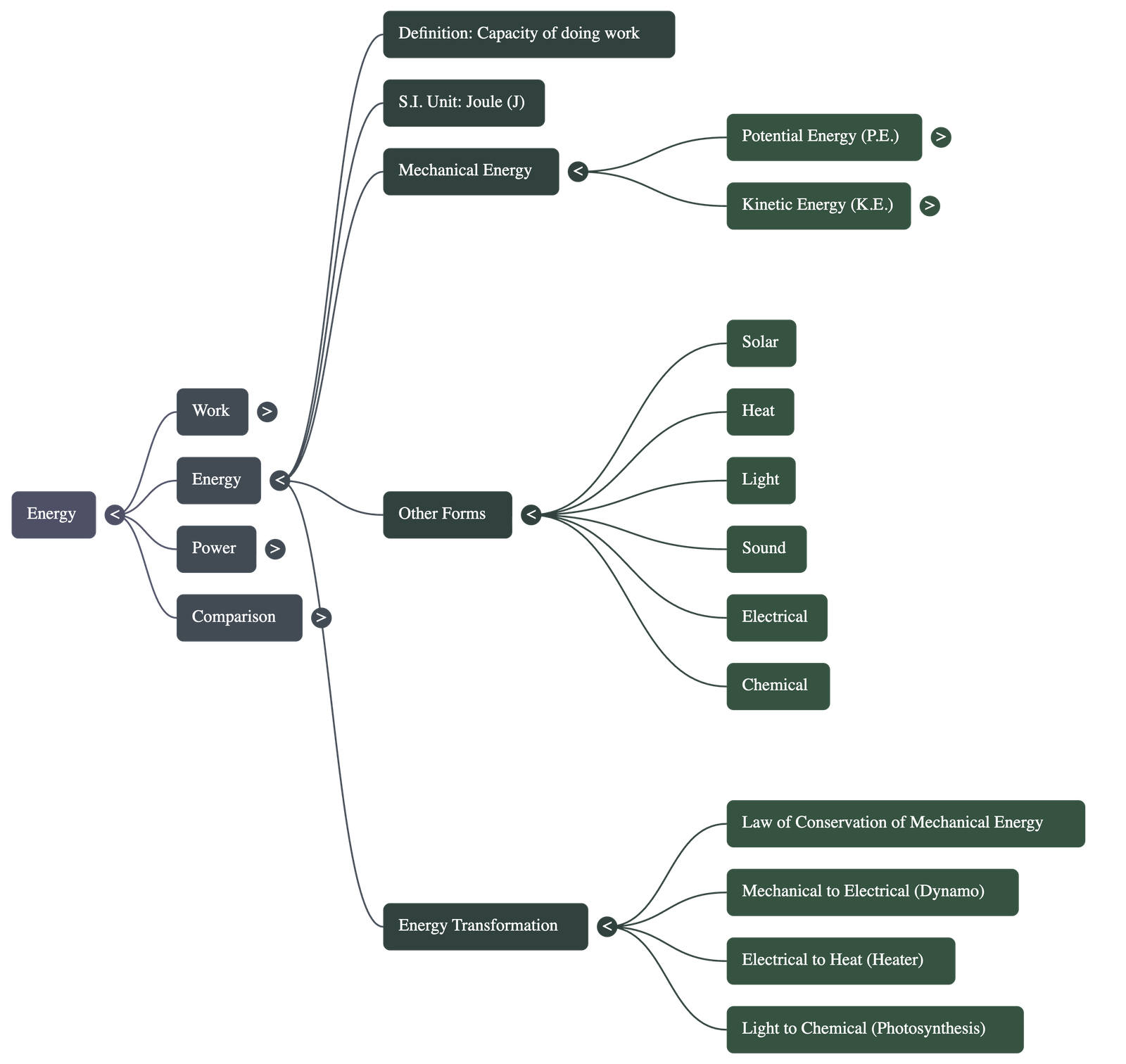 - Unit of Energy: Like work, the S.I. unit of energy is the joule (J).