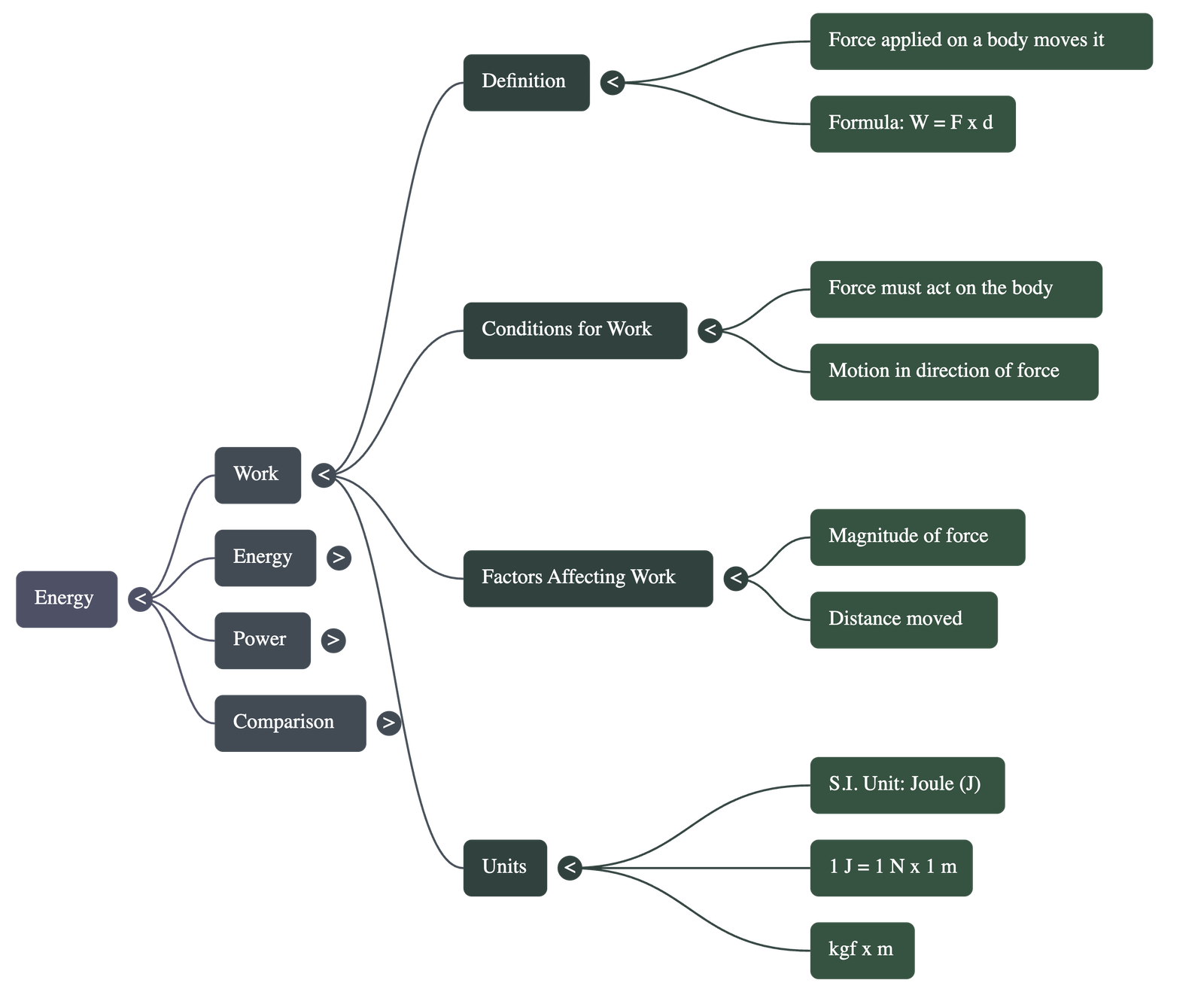 - Factors Affecting Work: The amount of work depends on the magnitude of the force applied and the distance the body moves.