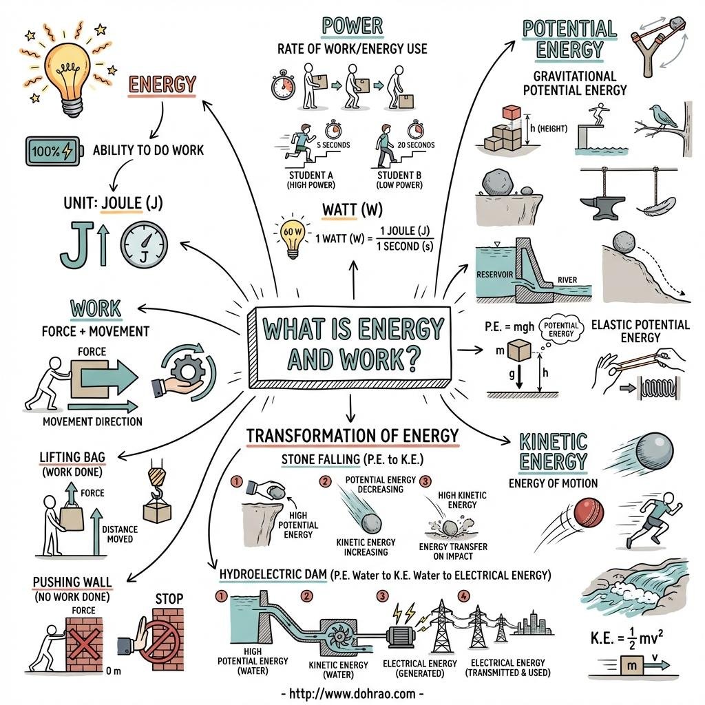 Analogy for Understanding: Think of Energy as the total amount of money in your bank account (your capacity to spend), Work as the actual transaction of buying something (the action performed), and Power as how fast you are spending that money over time.