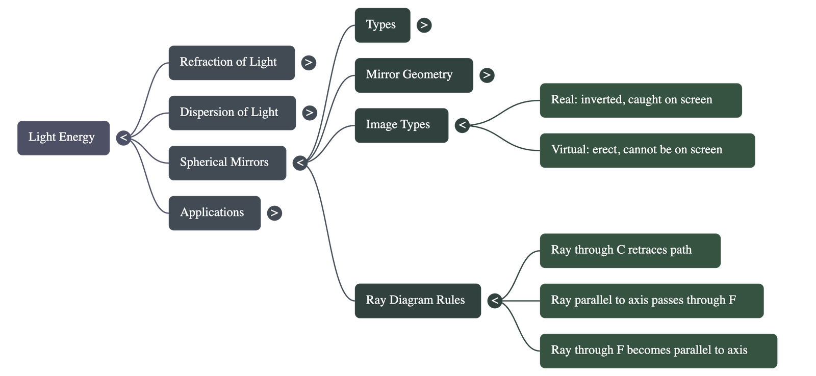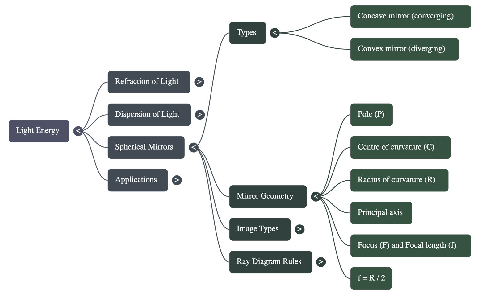 - Key Terms: Important concepts include the Pole (geometric center), Centre of Curvature (center of the sphere the mirror belongs to), and Principal Axis (line joining the pole and center of curvature).