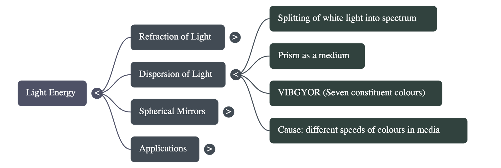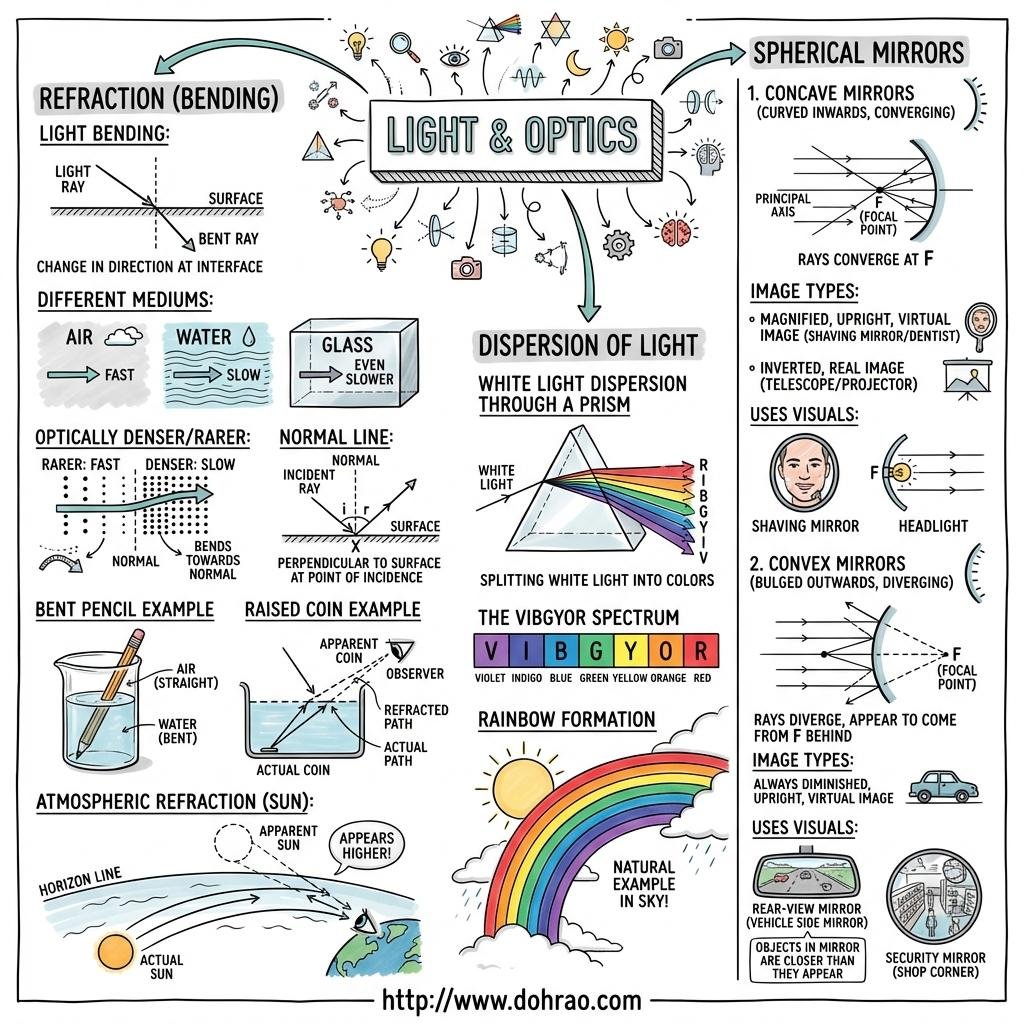 - Dispersion: This is the splitting of white light into its constituent colors (VIBGYOR: Violet, Indigo, Blue, Green, Yellow, Orange, Red) when passing through a prism.
