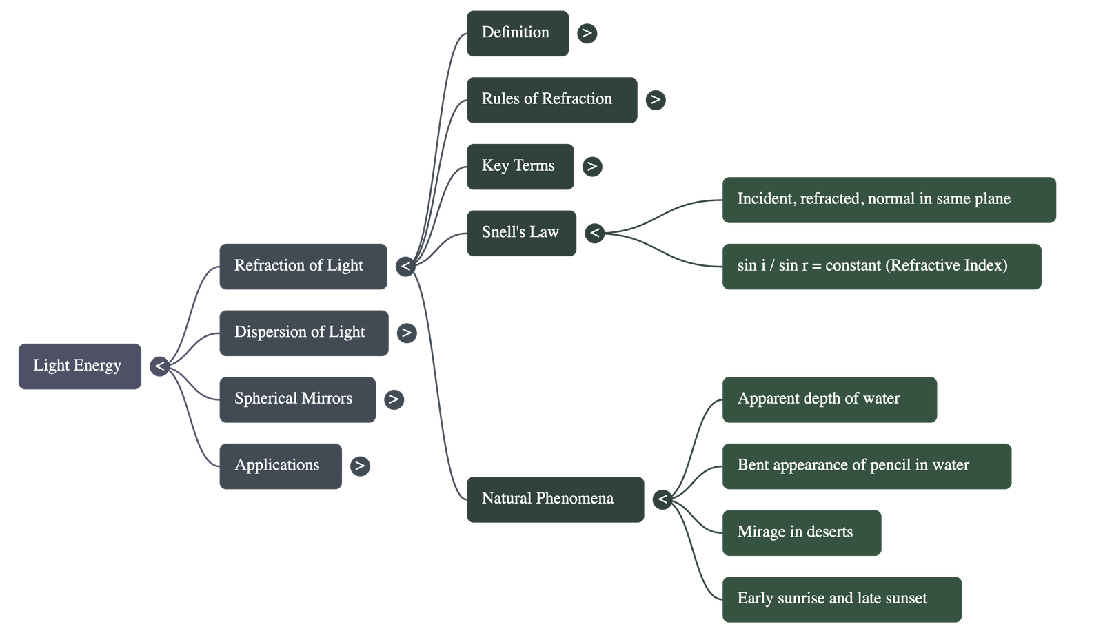 - Effects of Refraction: Common phenomena include the apparent depth of water appearing shallower, a pencil appearing bent in water, mirages in deserts, and the sun being seen slightly before sunrise and after sunset.