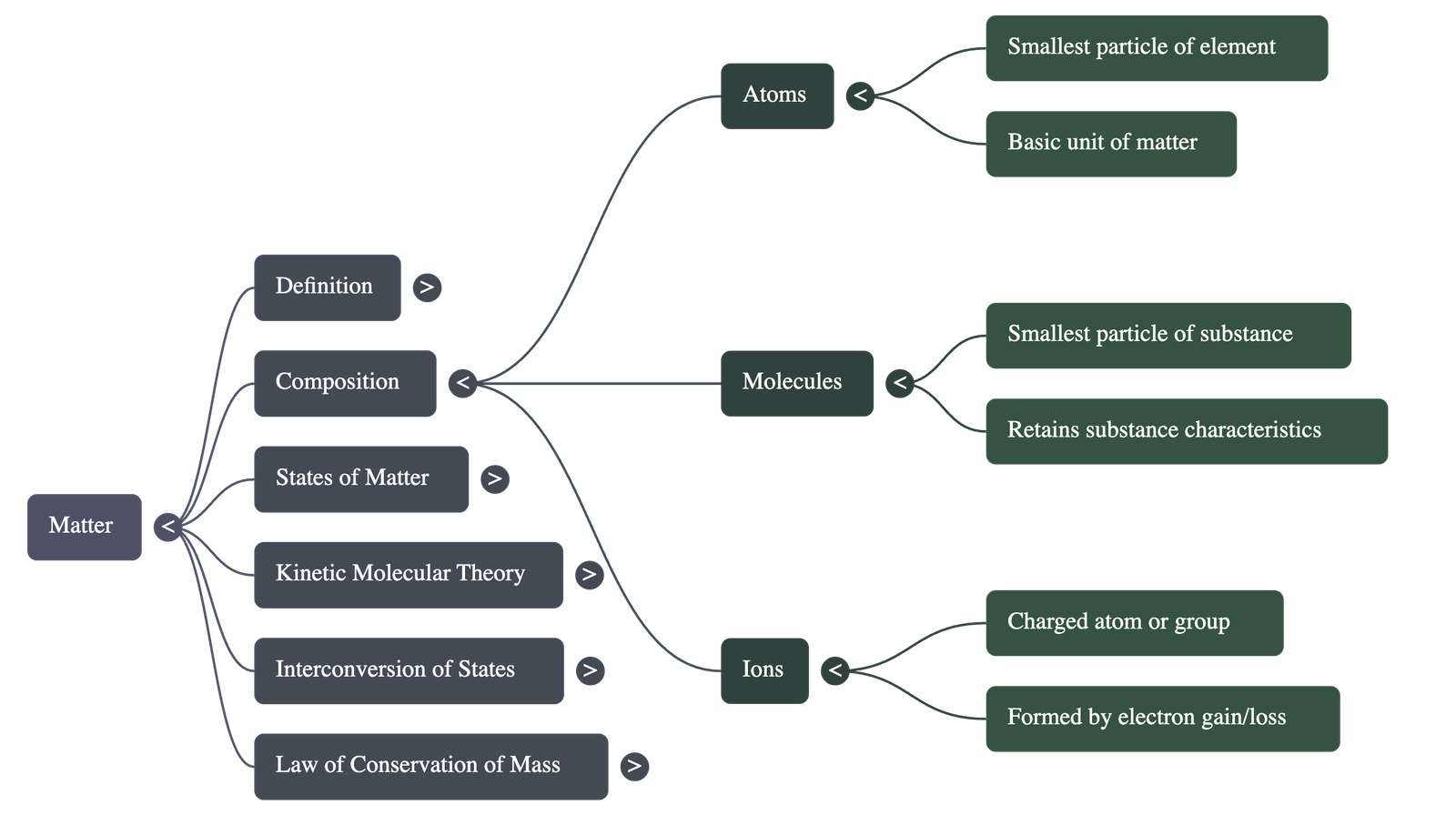 - It is composed of three types of small particles: atoms (smallest unit of an element), molecules (smallest unit of a substance retaining its characteristics), and ions (atoms or groups of atoms with a resultant charge).