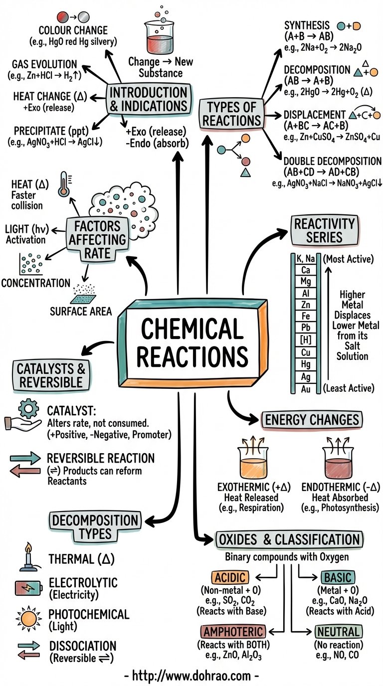 - Double Decomposition Reaction: A reaction where two reactants exchange their radicals to form two new compounds. This includes Neutralization (acid + base → salt + water) and Precipitation (formation of an insoluble solid).