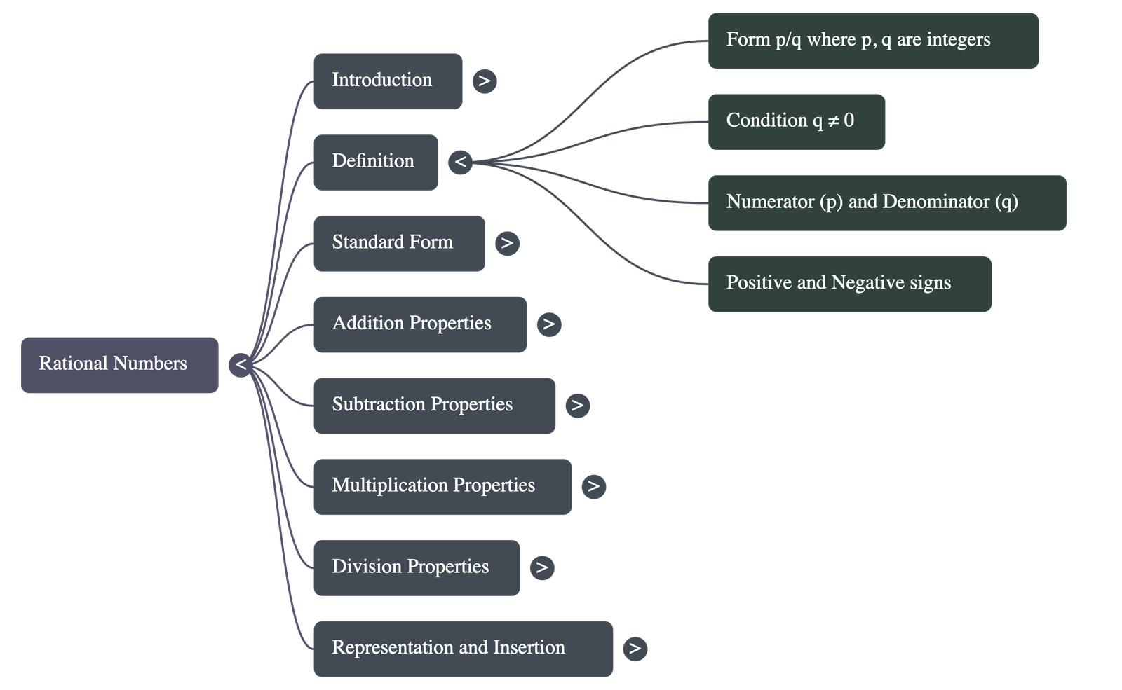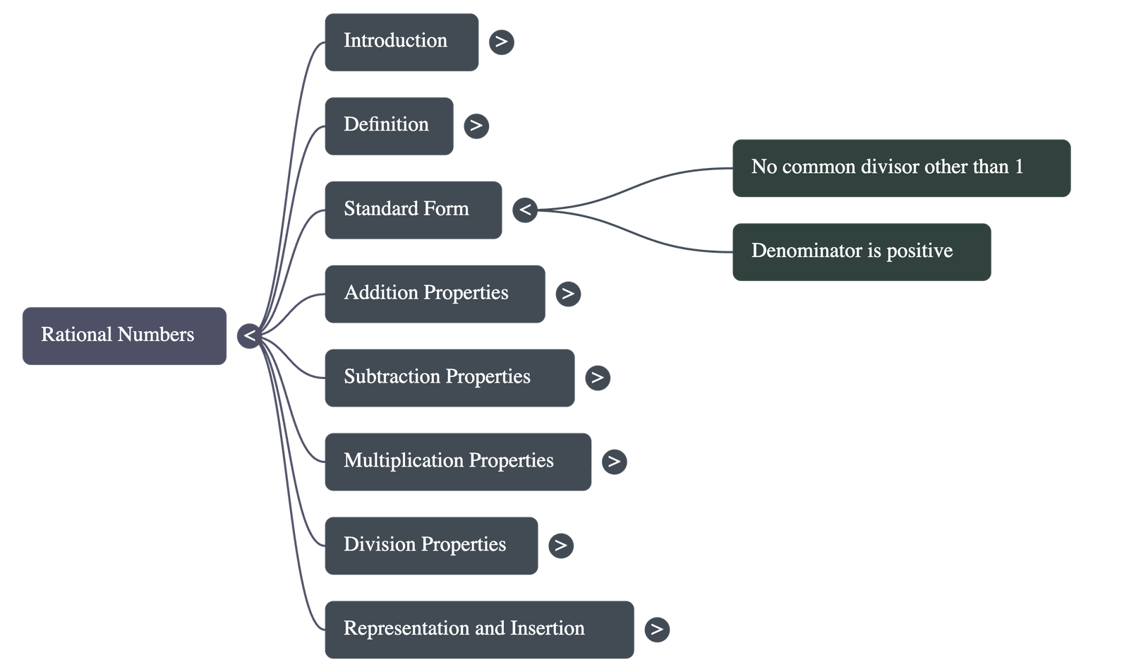 - Standard Form: A rational number is in standard form if p and q have no common divisor other than 1 and the denominator q is positive.