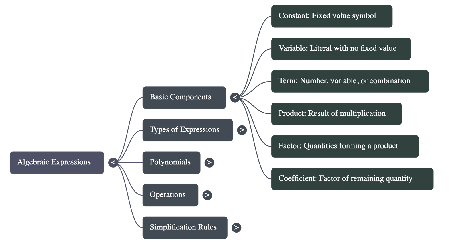 - Factors: Each quantity (constant or variable) that is multiplied to form a product. The constant part is the numeral factor, and the variable part is the literal factor.