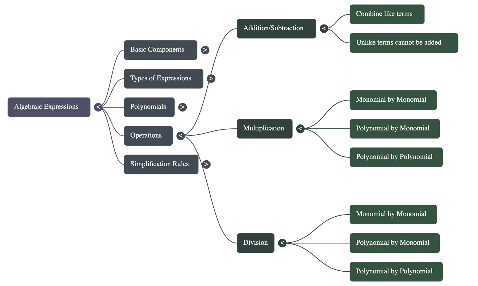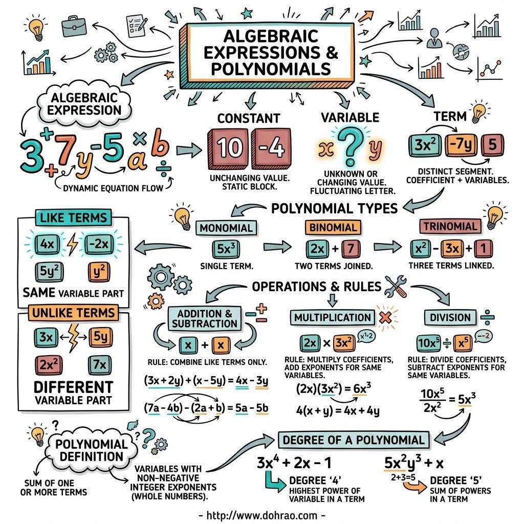- Addition & Subtraction: Performed by combining the numerical coefficients of like terms. Unlike terms must be kept separate.
