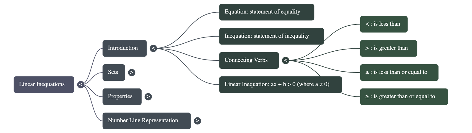 - Linear Inequation: If a and b are real numbers (and a is not zero), expressions like ax + b > 0 or ax + b ≤ 0 are defined as linear inequations.