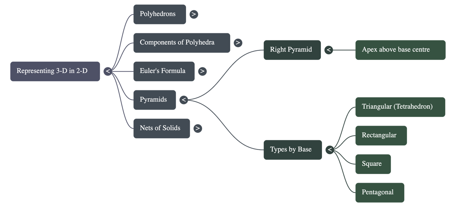 - A right pyramid has its apex directly above the centre of the base.