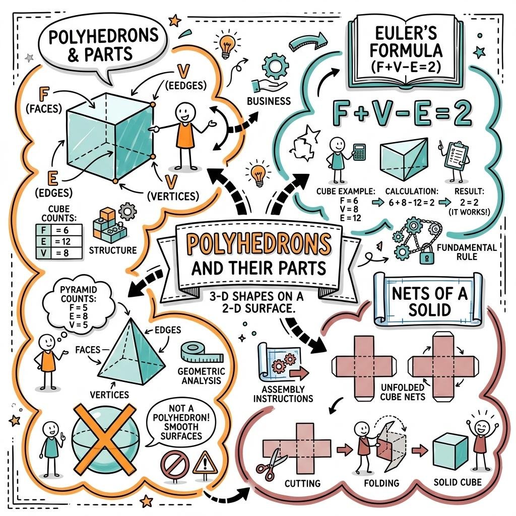 Key Takeaway: Visualising 3D shapes through their faces, edges, and vertices—and understanding how they unfold into 2D nets—is essential for mastering spatial geometry.