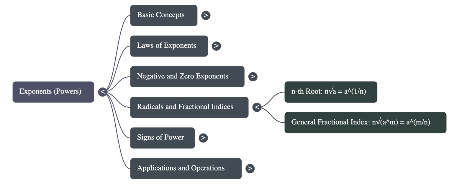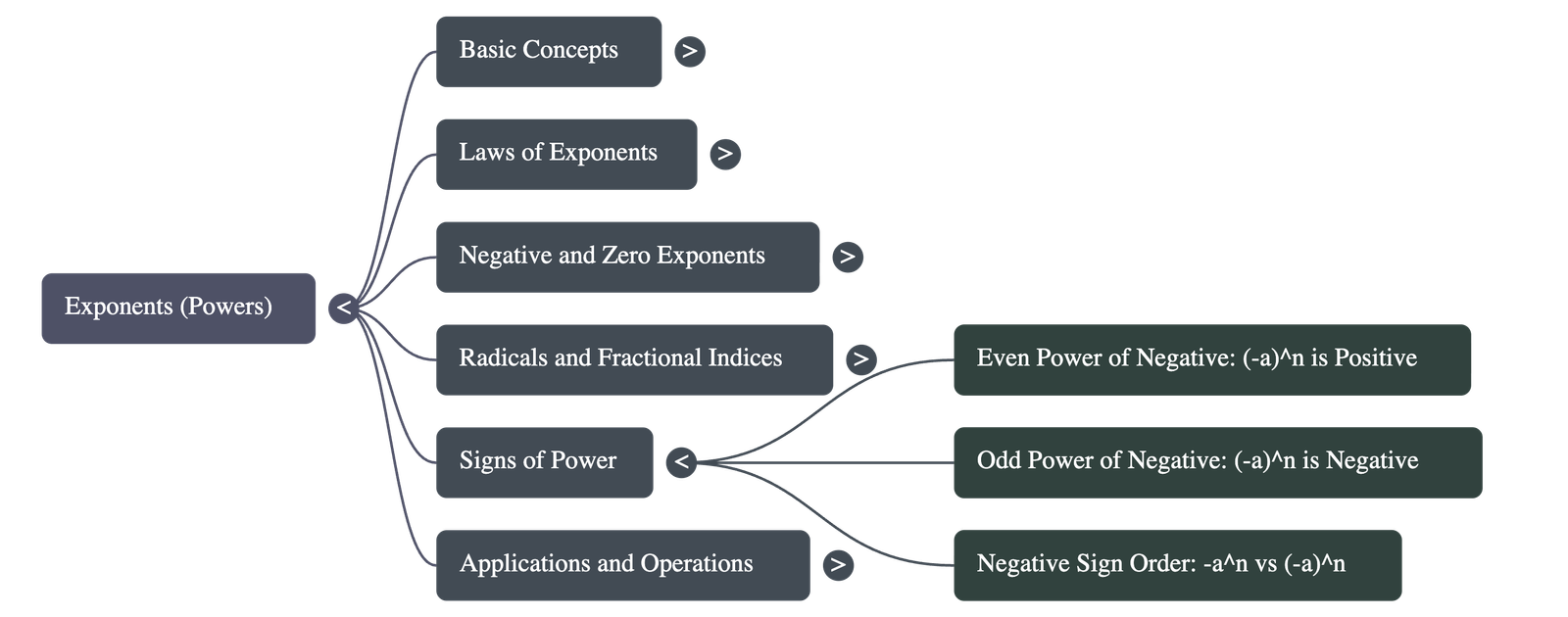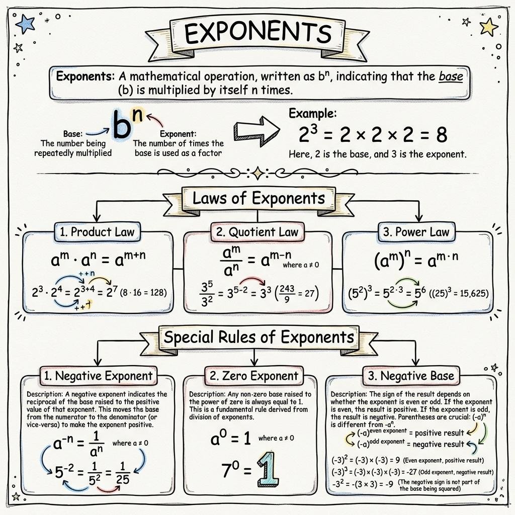 - Components: In the expression xn, x is the base and n is the exponent (also known as the index or power).