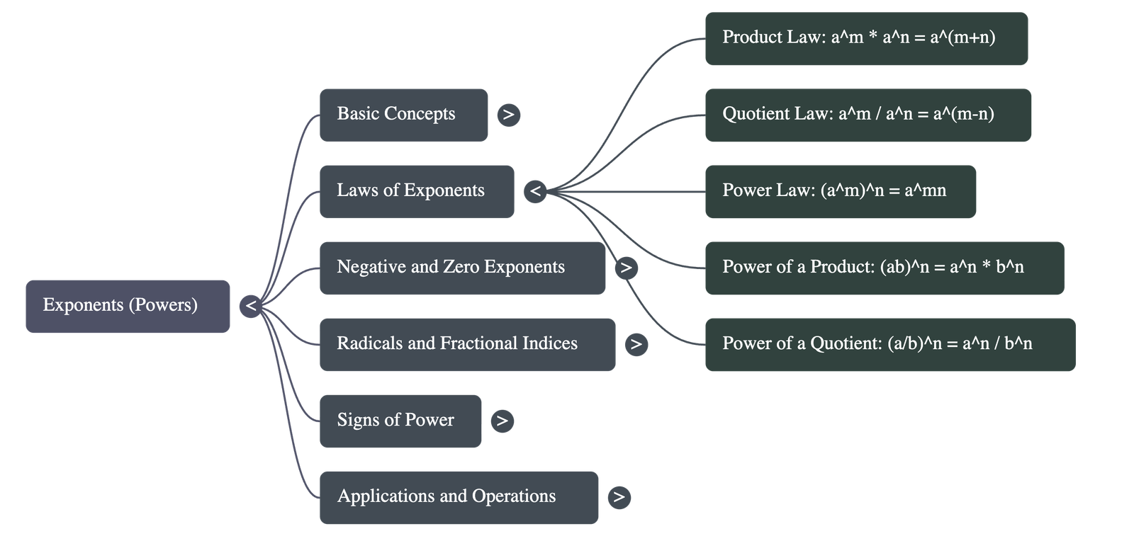 - Product Law: When multiplying powers with the same base, add the exponents: am × an = am+n.