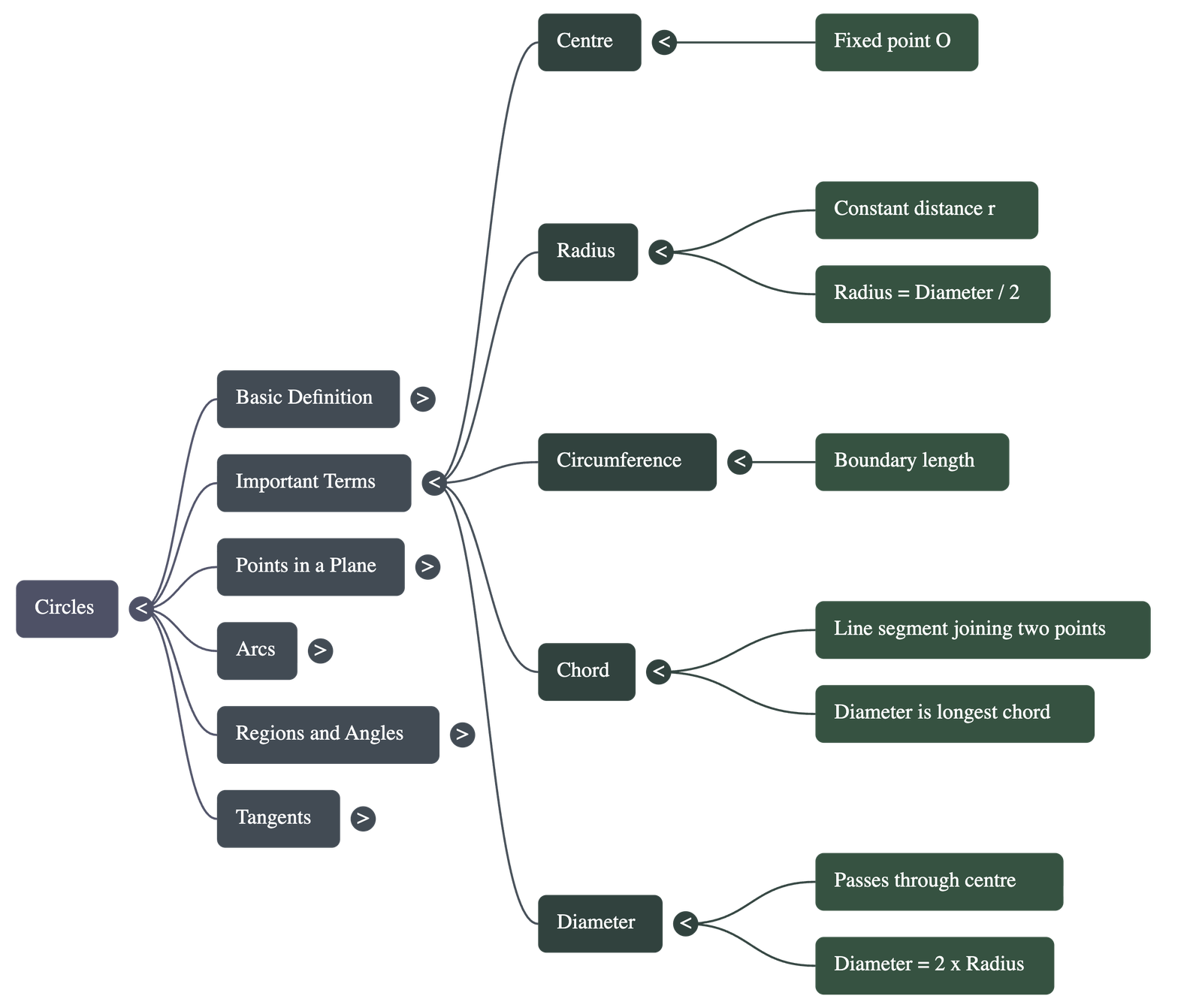 - Centre: The fixed point inside the circle from which all points on the boundary are equidistant.
