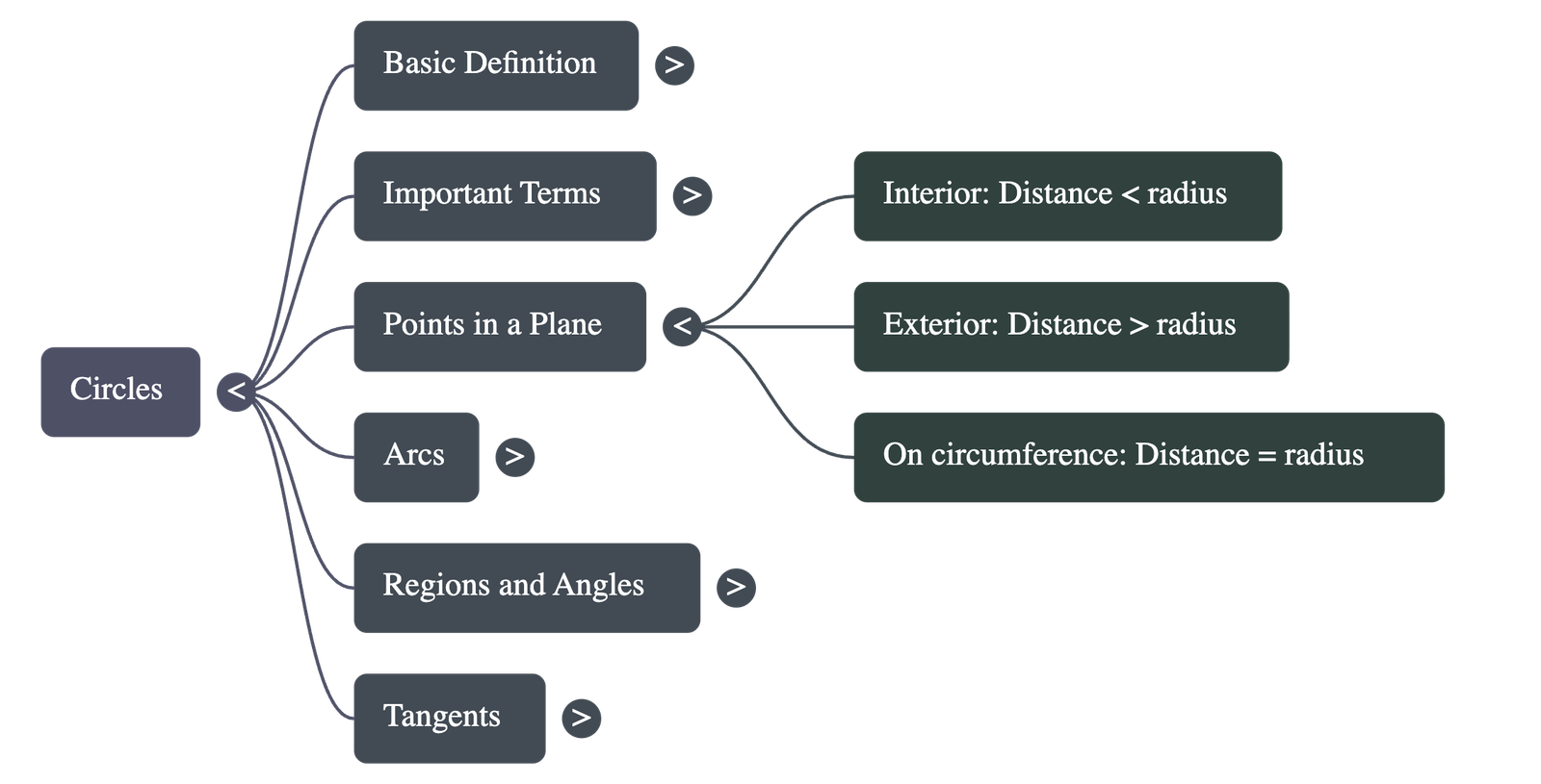 - Interior: The region inside the circle. A point is in the interior if its distance from the centre is less than the radius.