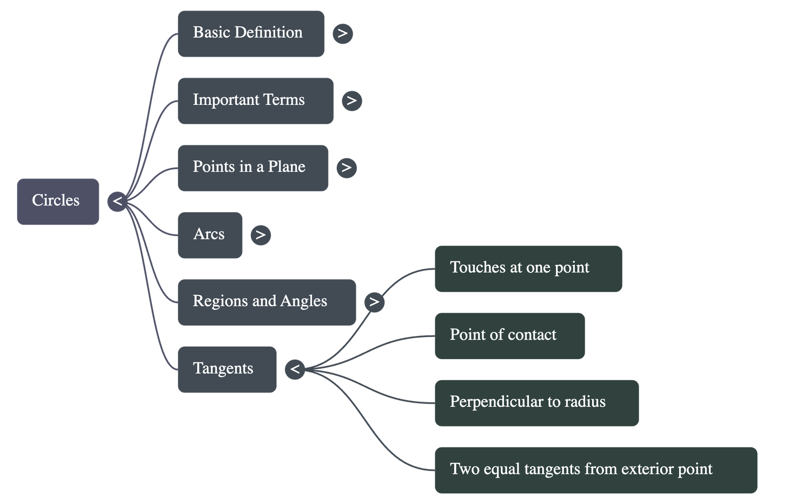 - Tangent: A straight line that touches the circle at exactly one point, known as the point of contact.
