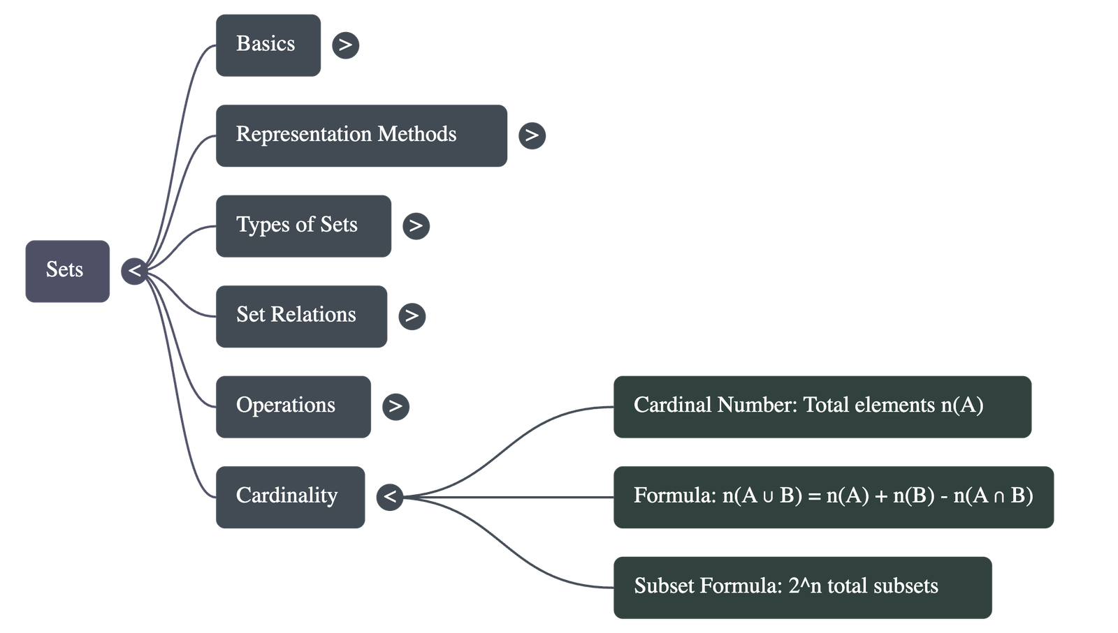 - Cardinal Number n(A): The number of distinct elements in a finite set.