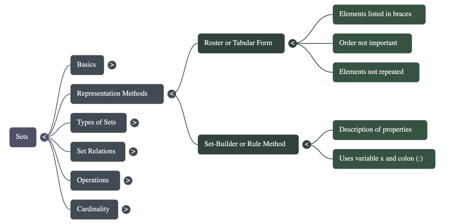 - Set-Builder (Rule) Method: Elements are described by a statement or formula expressing a common property. The symbol : or | is read as "such that."