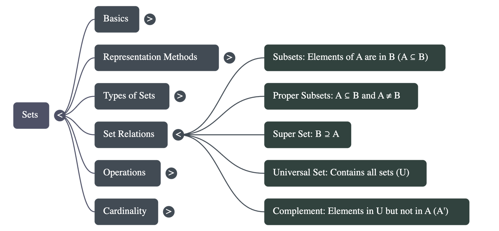 - Subsets: Set A is a subset of B (A ⊆ B) if every element of A is also in B. Every set is a subset of itself, and the empty set is a subset of every set.