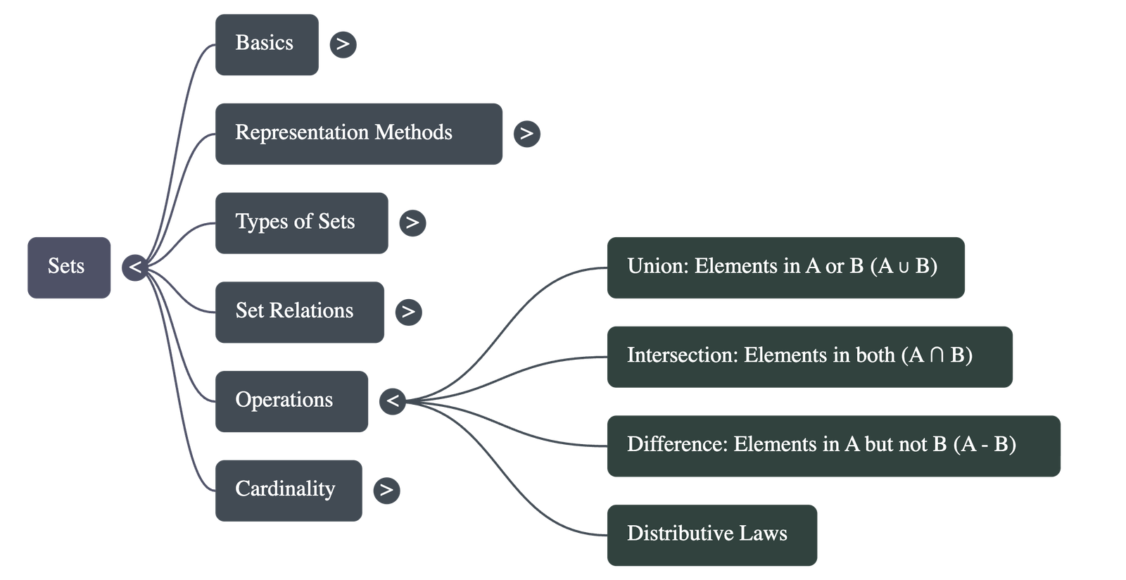 - Union (A ∪ B): A set containing all elements that belong to A, or B, or both. Union is commutative and associative.