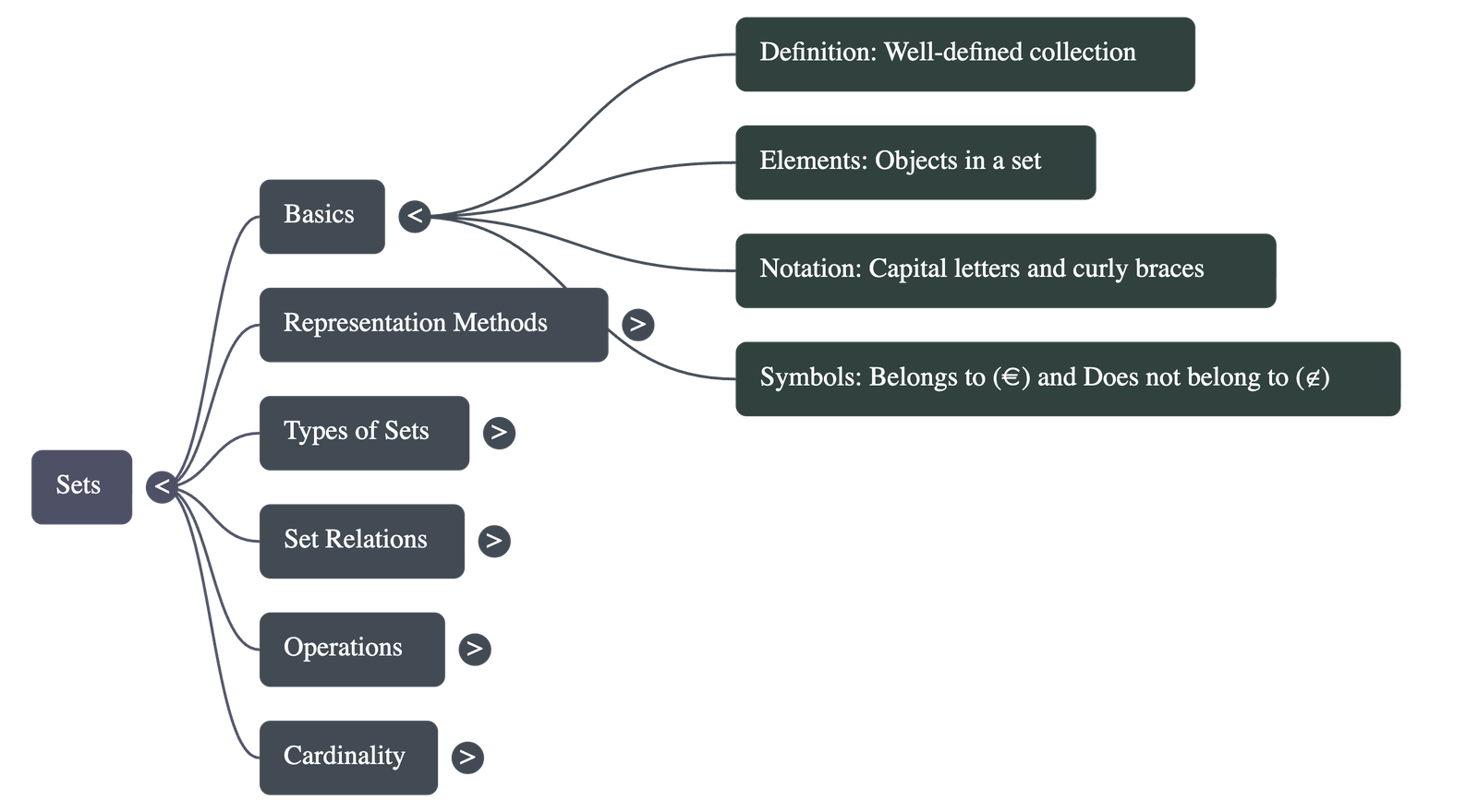 - Notation: The symbol ∈ indicates "belongs to," and ∉ indicates "does not belong to." Sets are typically represented by capital letters and elements are enclosed in curly braces { }.