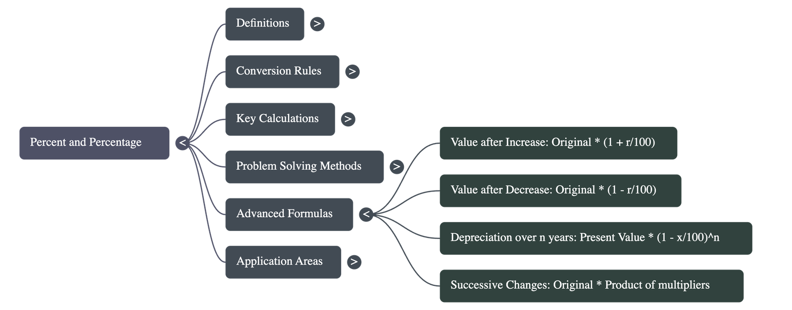 (1 + x/100)for increases or(1 - x/100)for decreases. - Successive Changes: When a value undergoes multiple changes (e.g., a 10% decrease followed by a 20% increase), the final result is found by multiplying the original number by each successive change factor.