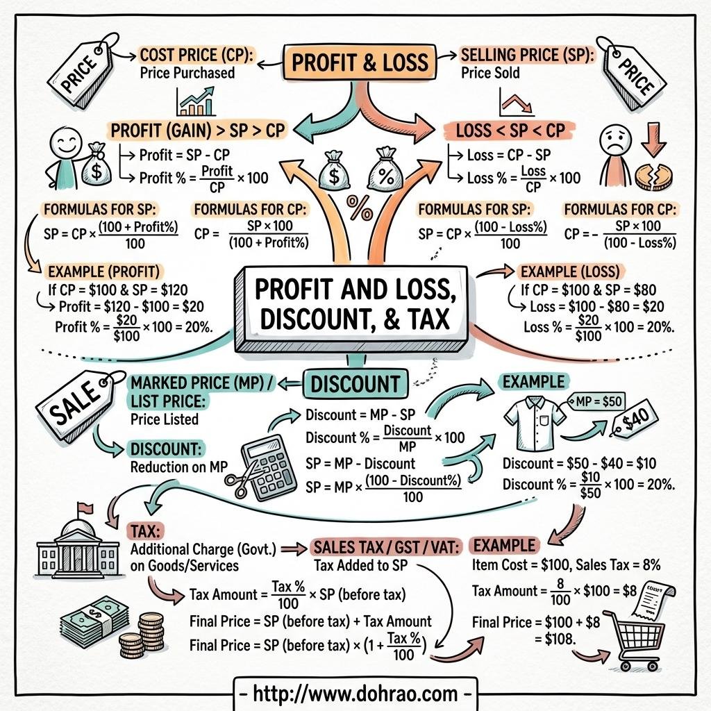 - Crucial Rule: Both Profit percentage and Loss percentage are always calculated on the Cost Price (C.P.).