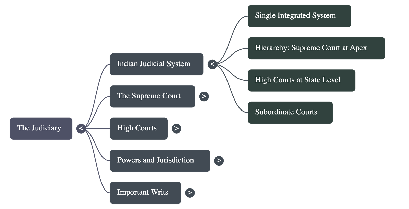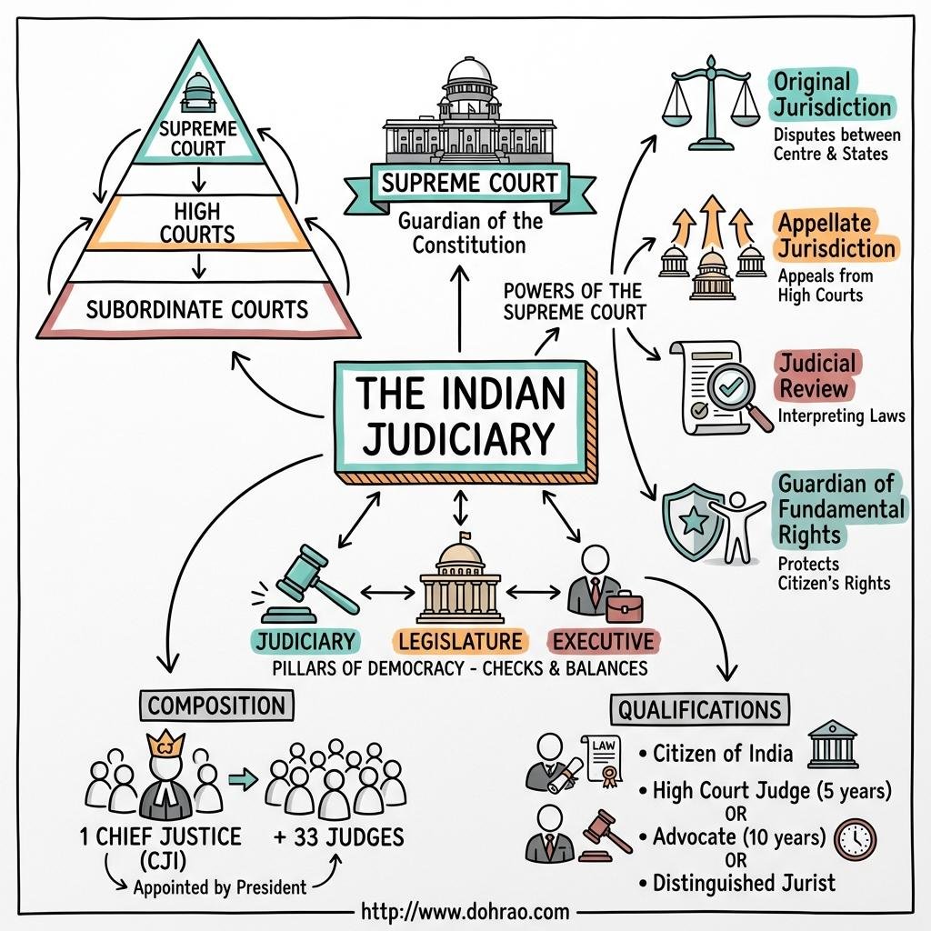 - Single Integrated System: India maintains a unified judicial hierarchy. The Supreme Court sits at the apex, followed by High Courts at the state level, and Subordinate Courts at the district level.