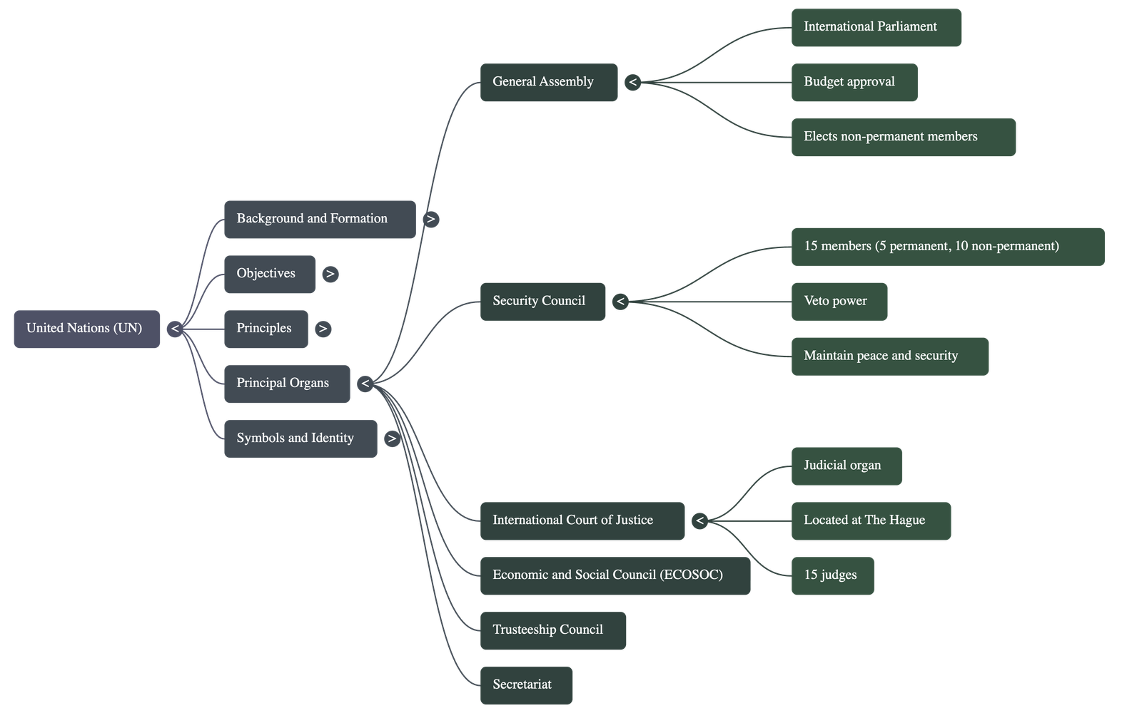 - International Court of Justice (ICJ): Based in The Hague (Netherlands), it is the judicial organ. It consists of 15 judges who resolve legal disputes between nations and provide legal opinions.