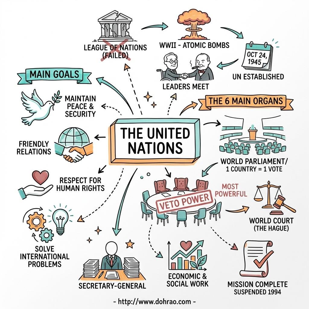Analogy for Understanding: Think of the United Nations as a global neighborhood association. The General Assembly is like a town hall meeting where every neighbor gets a voice. The Security Council acts as a small emergency response committee with special "veto" locks held by the oldest residents to ensure no major changes are made without their agreement. The International Court of Justice is the mediator that settles property line disputes, and the Secretariat is the administrative office that keeps the neighborhood's records and daily operations running smoothly.