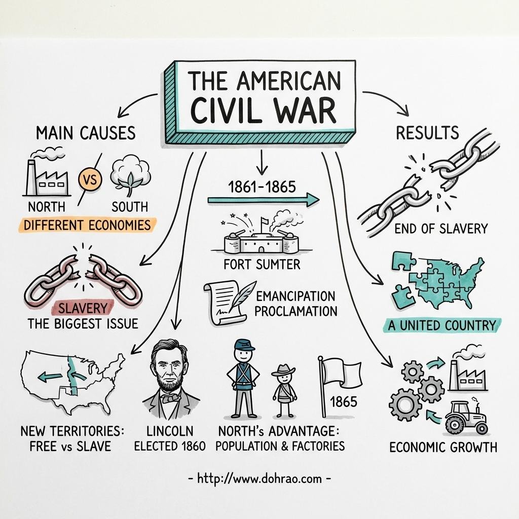 Analogy for Understanding: To understand the American Civil War, imagine a large family estate where the siblings in the North wing want to run a modern tech business, while the siblings in the South wing want to keep an old-fashioned farm using forced help. When the siblings cannot agree on the rules for the house, the South tries to break away and build their own wall, leading to a massive fight. The war was the painful process of tearing down that wall to ensure the family remained under one roof with one set of fair rules for everyone.