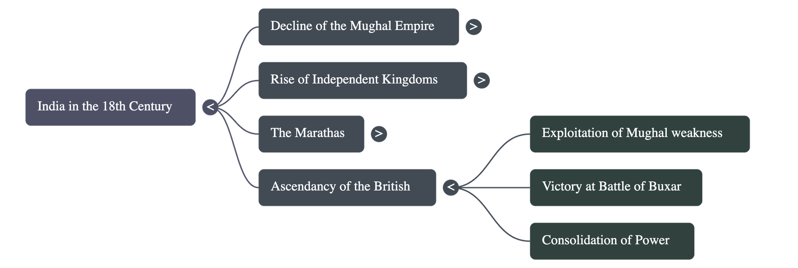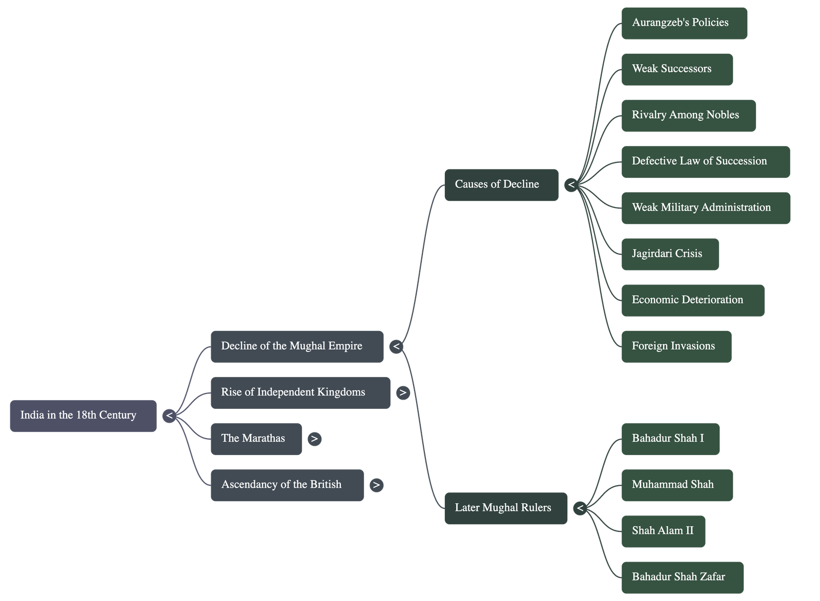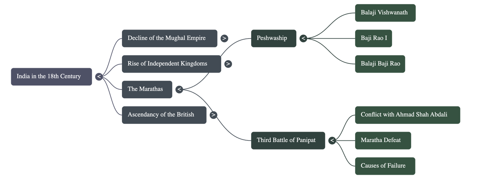The 18th century in India was defined by the decline of the Mughal Empire, the rise of independent regional kingdoms, and the eventual ascendancy of the British.