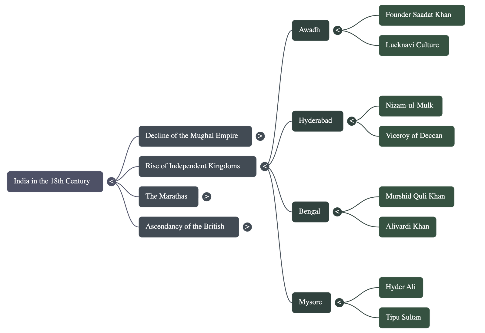 • Awadh: Founded by Saadat Khan in 1722, it became a center of the distinct "Lucknavi" culture, excelling in literature and architecture.