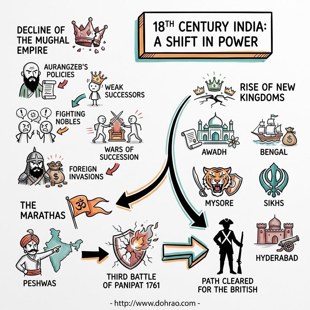 Analogy for Understanding: The 18th-century Mughal Empire was like a grand, centuries-old banyan tree that had begun to rot from within. While its massive trunk (the central authority) grew brittle due to internal decay and pests (administrative and succession crises), many of its sprawling branches (provincial governors) dropped roots of their own to become independent trees. When a series of external storms (foreign invasions) finally snapped the main trunk, these smaller trees competed for space, until a new gardener (the British) arrived to prune them all back and take control of the entire garden.