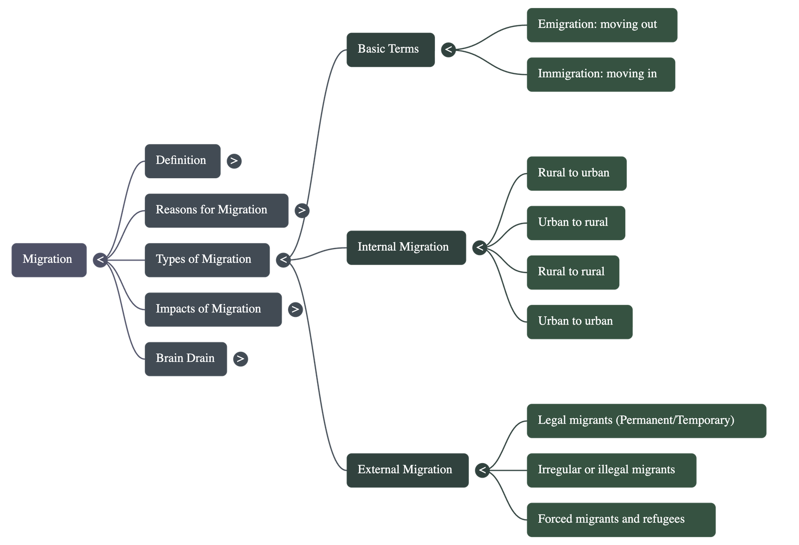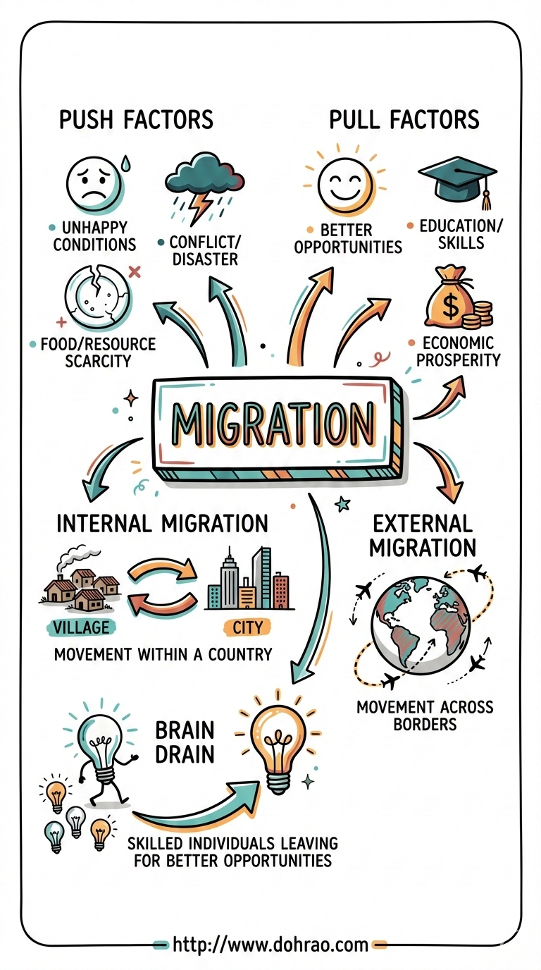To understand the different "flows" of people, you can think of migration like a biological cell membrane: push factors are the internal pressures that force molecules out, while pull factors are the external attractions that draw them in. "Brain drain" is like the cell losing its most vital nutrients, which it must eventually try to recover through "reverse brain drain" to remain healthy and grow.