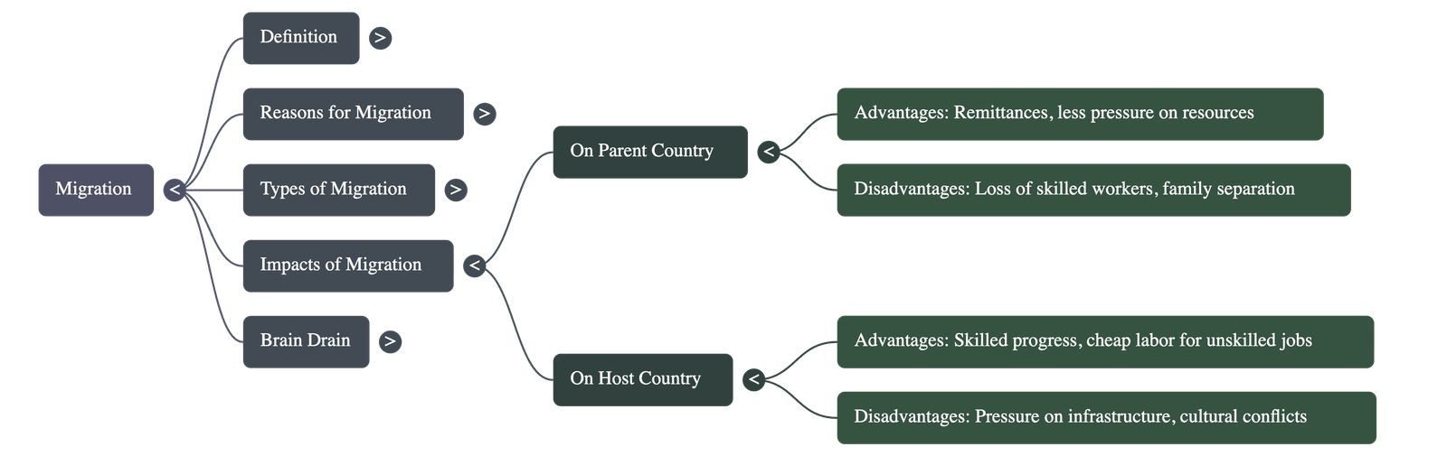 Migration is caused by "Push" and "Pull" factors. Push factors (like natural disasters, lack of jobs, war, or instability) force people to leave a place. Pull factors (like better living conditions, medical care, education, and political freedom) attract people to a new location. - Analyse the impact of migration on the parent country and the host country.