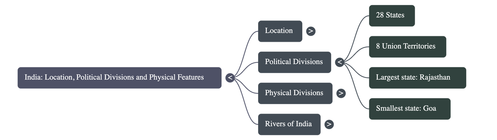Point-wise summary of Chapter 8, which details India's geographical location, political structure, and physical landscape: