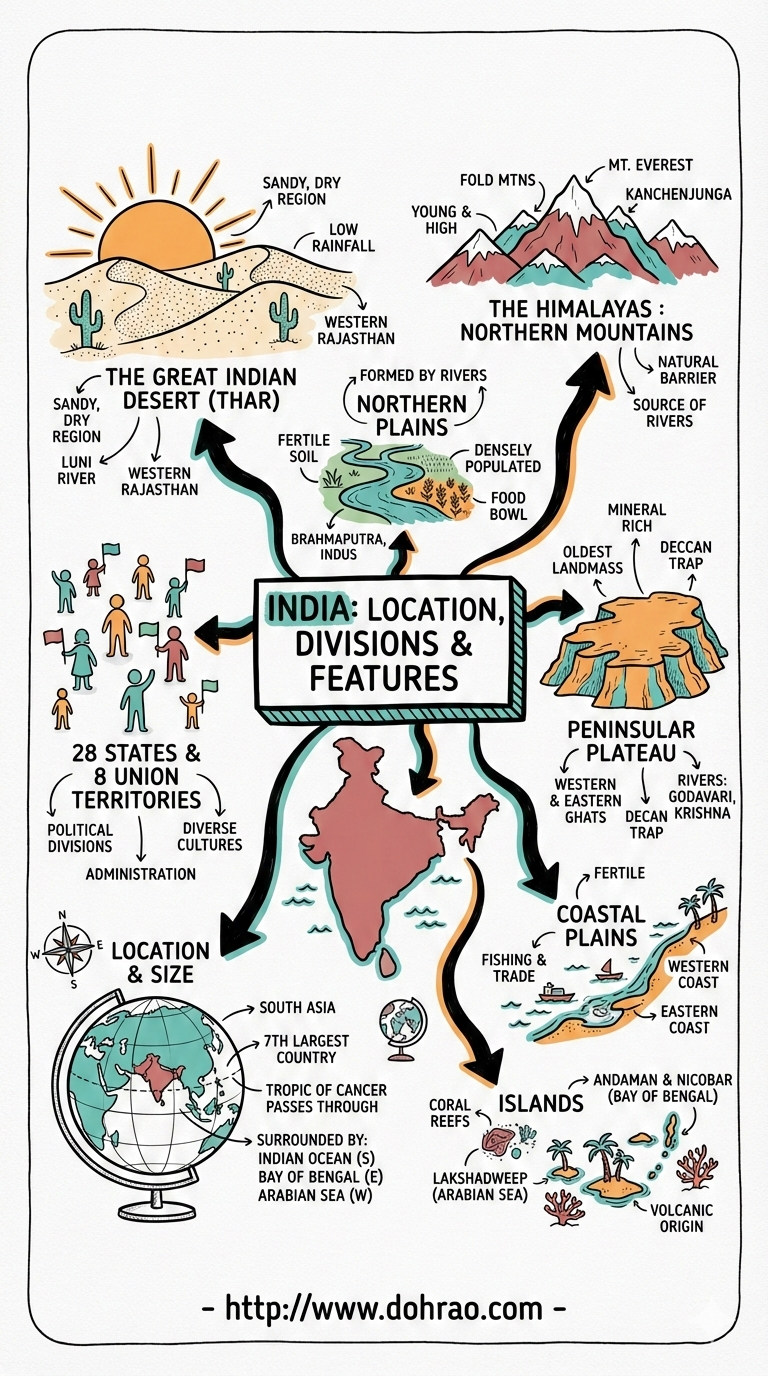 Analogy for Understanding: To visualize India’s geography, imagine a grand fortress: the Himalayas are the high, protective northern walls; the Northern Plains are the lush, central courtyard where everyone gathers to eat; the Peninsular Plateau is the ancient, raised stone foundation; and the Coastal Plains are the scenic balconies overlooking the surrounding moats of the Arabian Sea and Bay of Bengal.