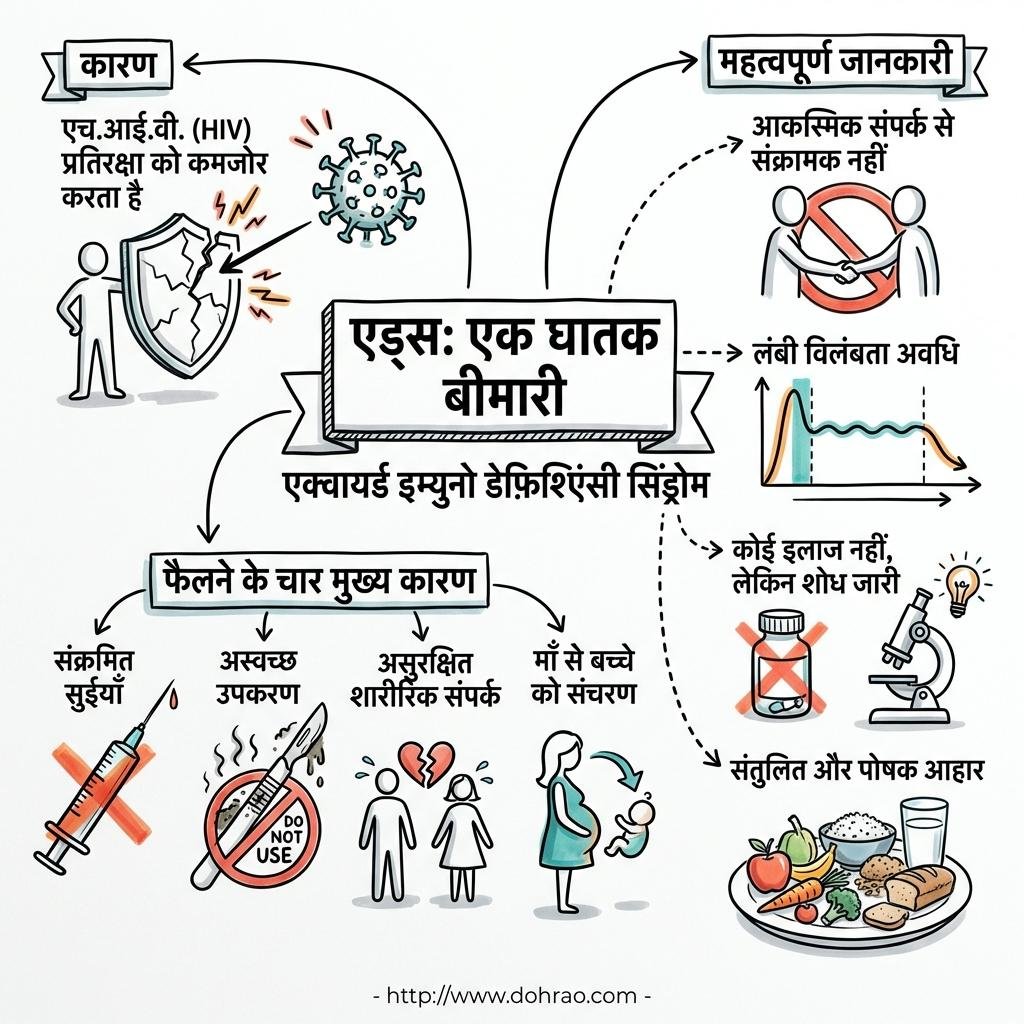 उपमा: एड्स शरीर की रोग-प्रतिरोधक क्षमता पर उसी तरह हमला करता है जैसे किसी किले की सुरक्षा दीवार का ढह जाना; जब दीवार (इम्युनिटी) गिर जाती है, तो कोई भी छोटा दुश्मन (बीमारी) आसानी से अंदर घुसकर नुकसान पहुँचा सकता है।