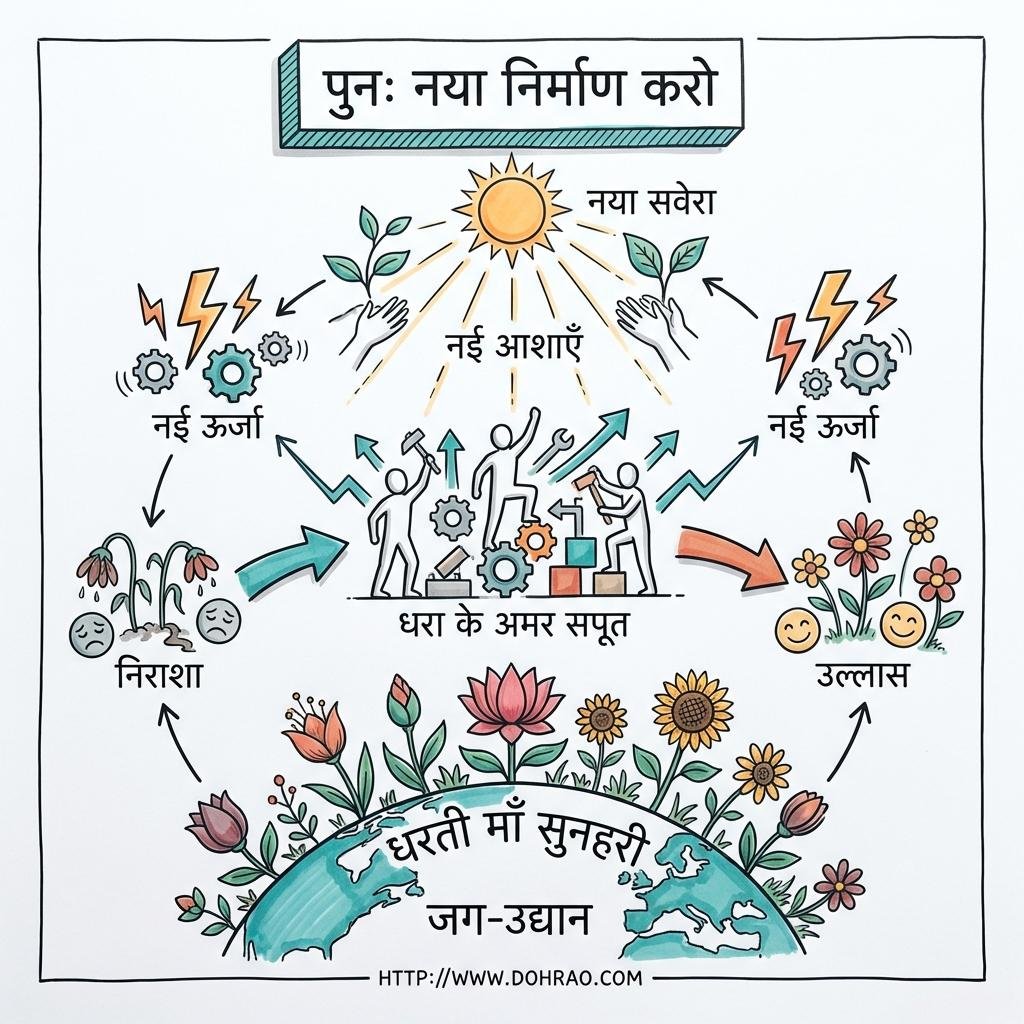 - नवनिर्माण का आह्वान: कवि धरती के 'अमर सपूतों' को संबोधित करते हुए उन्हें उठने और देश का पुनः नया निर्माण करने के लिए प्रेरित करते हैं।
